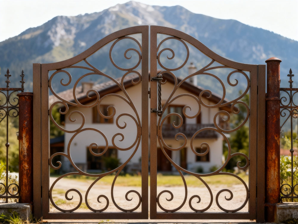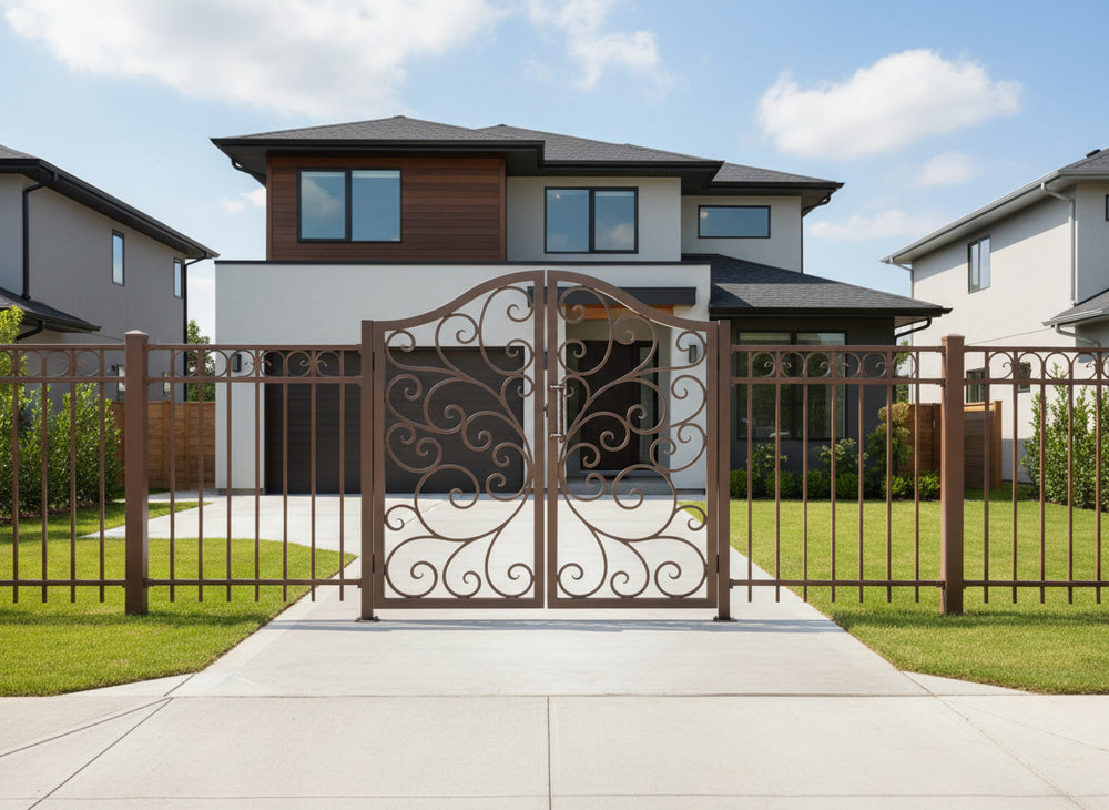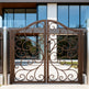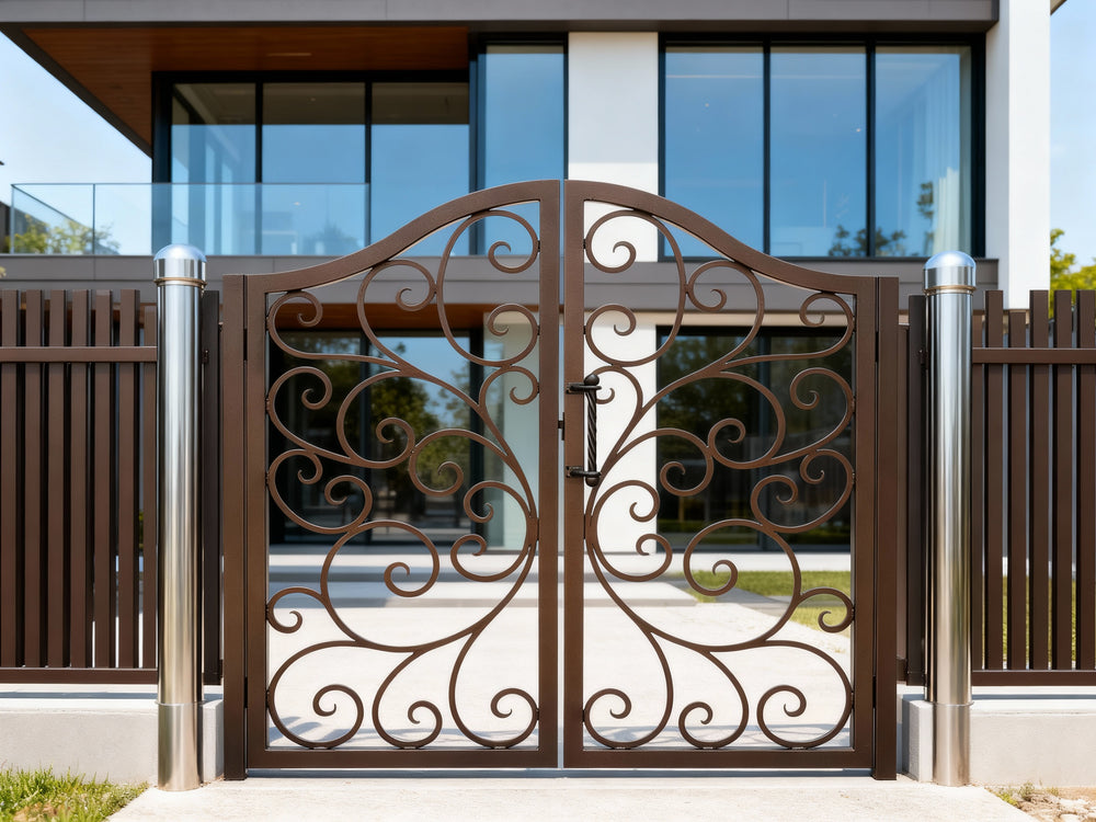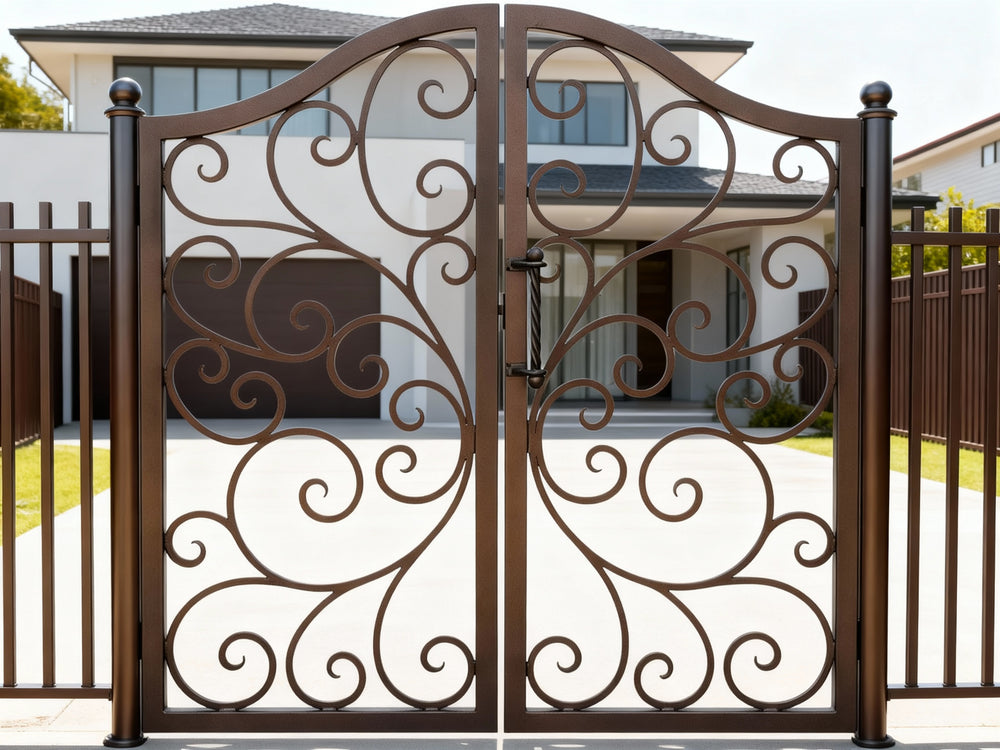 A door that flows with elegance. Scrollveil Passage features two mirrored panels adorned with swirling scrollwork, curvilinear accents, and a gentle arched top. The design evokes classical charm and ornamental richness—ideal for garden entries, courtyard transitions, or upscale residential boundaries that blend artistic craftsmanship with secure structure.
