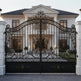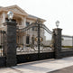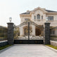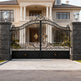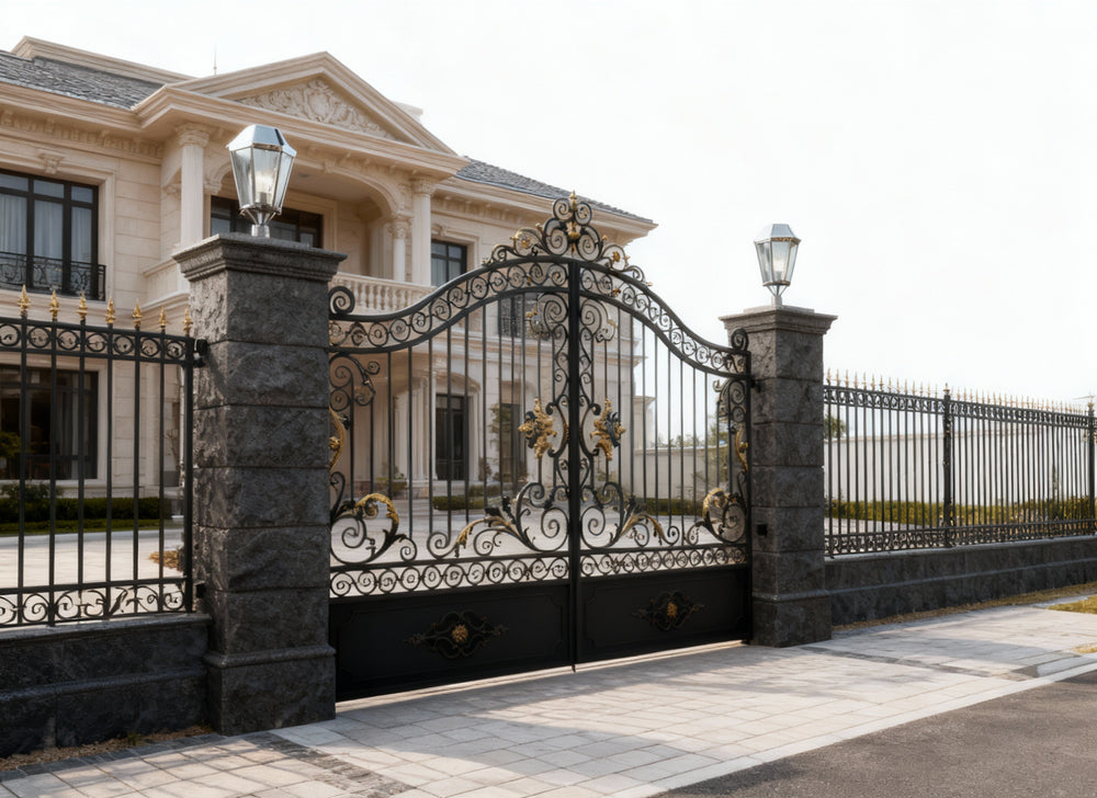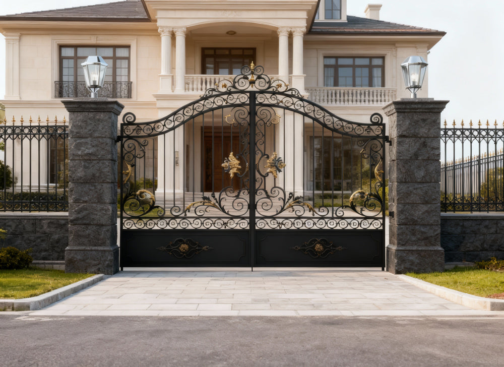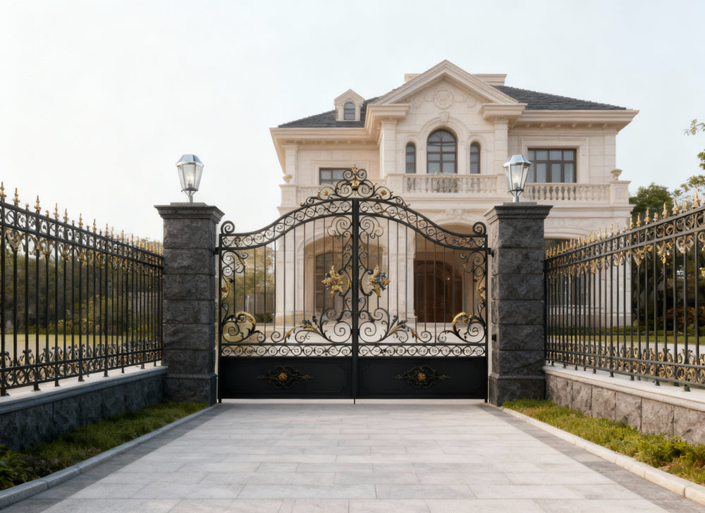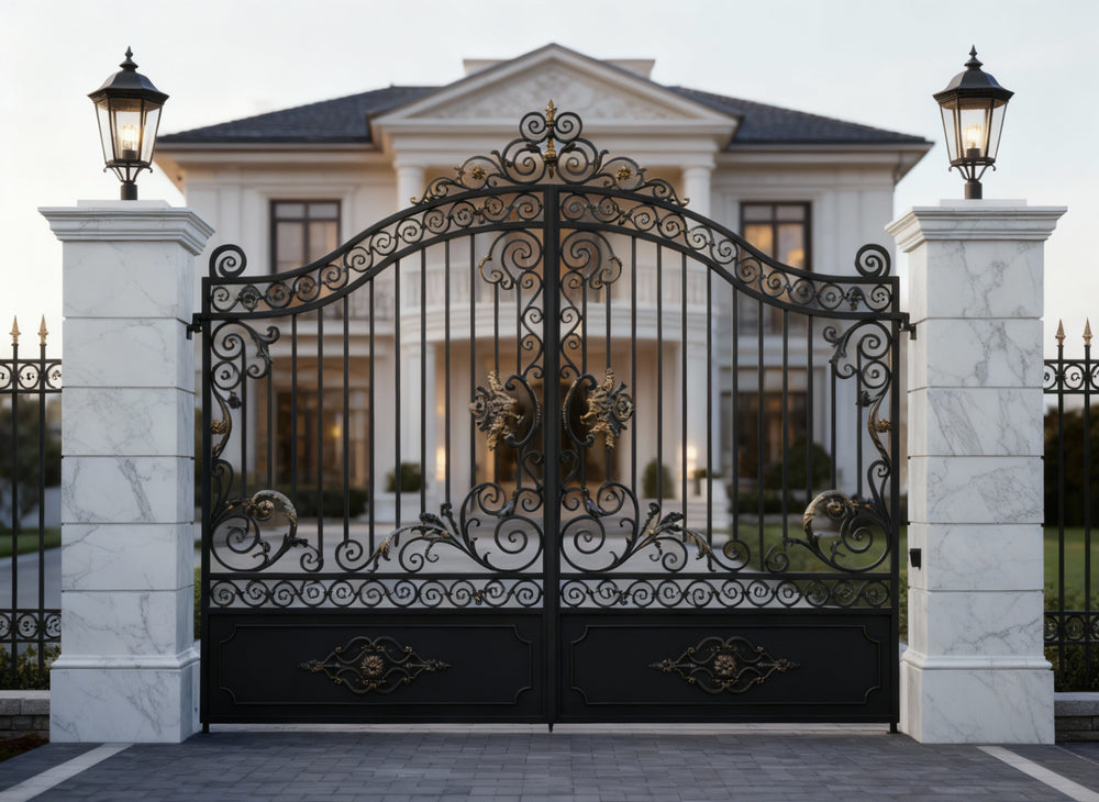 A gate that greets with grandeur and grace. Shell crest Aurelia features dual swing panels with solid lower sections and upper scrollwork adorned with golden floral motifs and mirrored bird flourishes. The arched top is crowned by a shell-like crest and circular medallions, while the flanking white marble pillars—topped with lanterns—frame the gate like a ceremonial arch. This design evokes nobility, craftsmanship, and timeless elegance—perfect for entrances that must impress before a word is spoken.