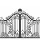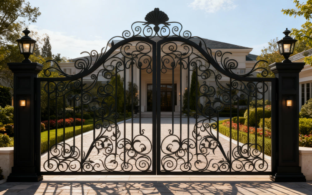 A gate that opens with grace. Shell crest Elegance features dual swing panels crowned by a shell-like flourish at the apex, framed by flowing scrollwork and floral motifs. The symmetrical layout is anchored by solid vertical bars and flanked by tall square pillars topped with classic lanterns. This design evokes serenity, sophistication, and timeless charm—perfect for garden estates or refined residential entrances.