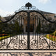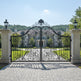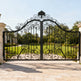shell crest wrought iron gate, floral scroll estate gate, lantern pillar driveway gate, Canadian custom gate, Taimco decorative gate, luxury property gate, romantic ornamental gate, heavy-duty artistic gate design