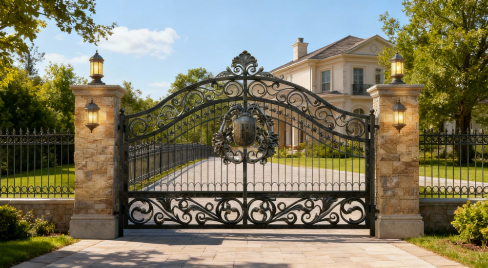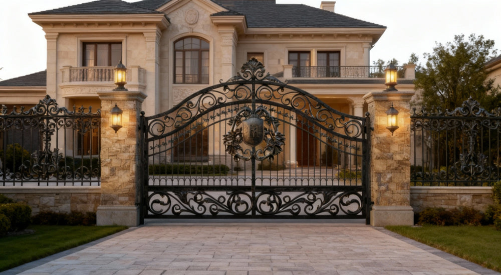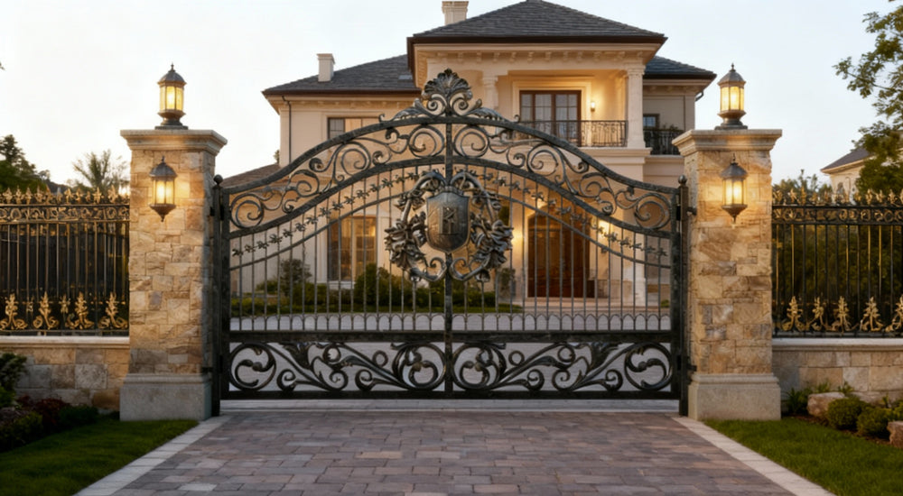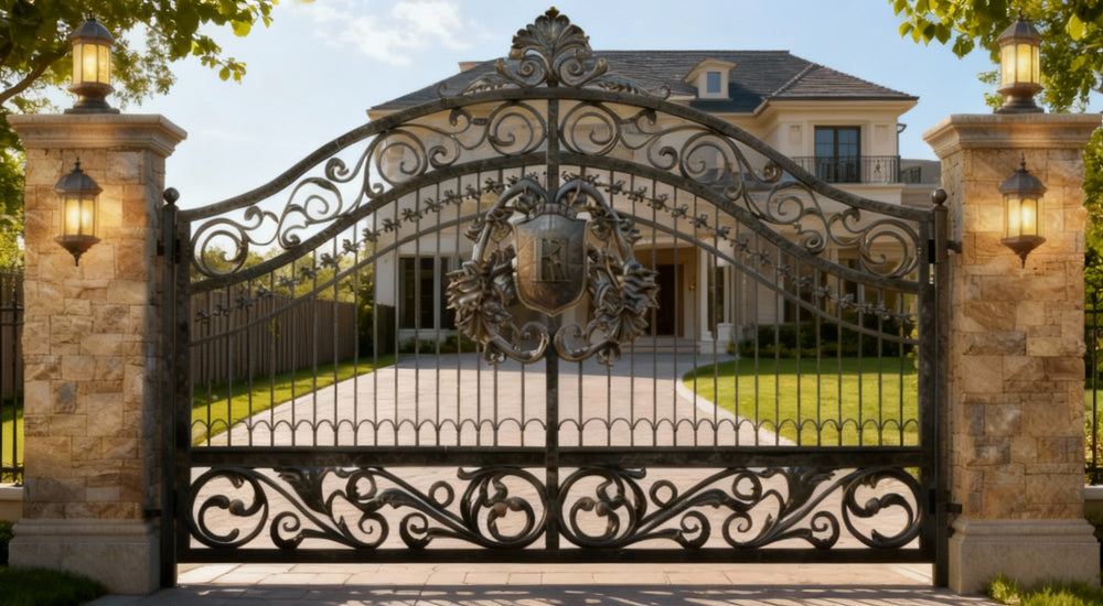A gate that guards with grace and grandeur. Shieldcrest Dominion features dual swing panels with solid lower sections and upper vertical bars adorned with floral scrollwork. The arched top is crowned with a central shield crest and decorative finial, while the flanking stone pillars host dual lanterns—one perched above, one mounted midway—casting layered illumination across the entrance. This design evokes nobility, craftsmanship, and timeless elegance—perfect for entrances that must impress before a word is spoken.