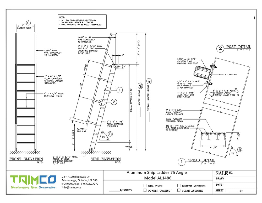 Ship Aluminum Ladders 60 & 75 Standard Degrees - Model # SL1486