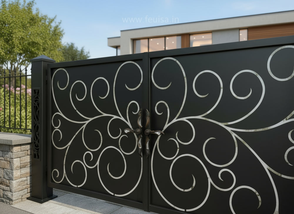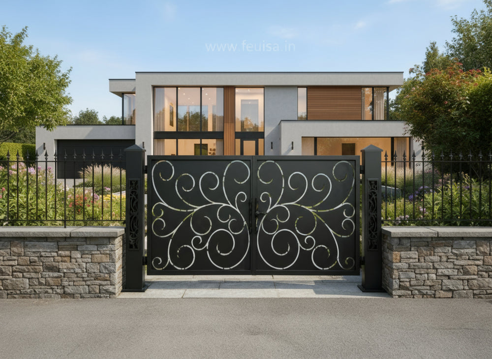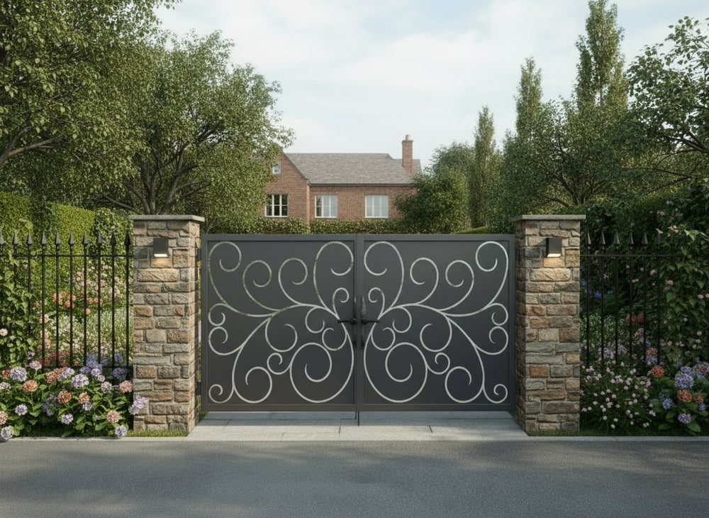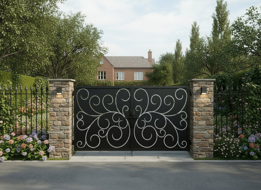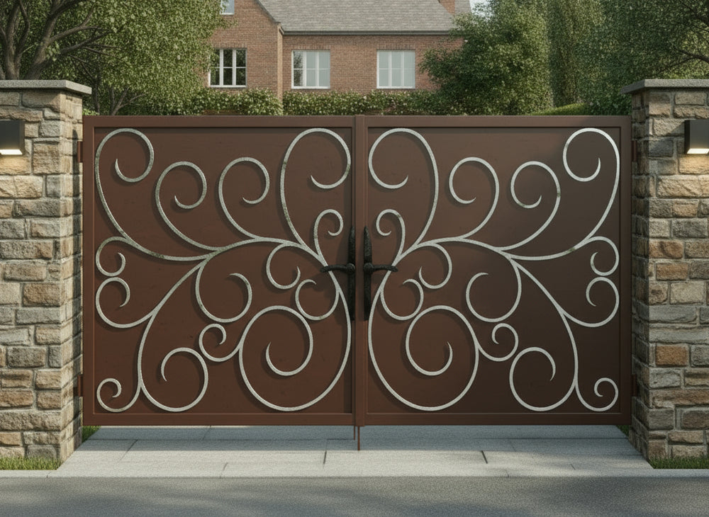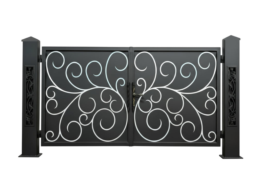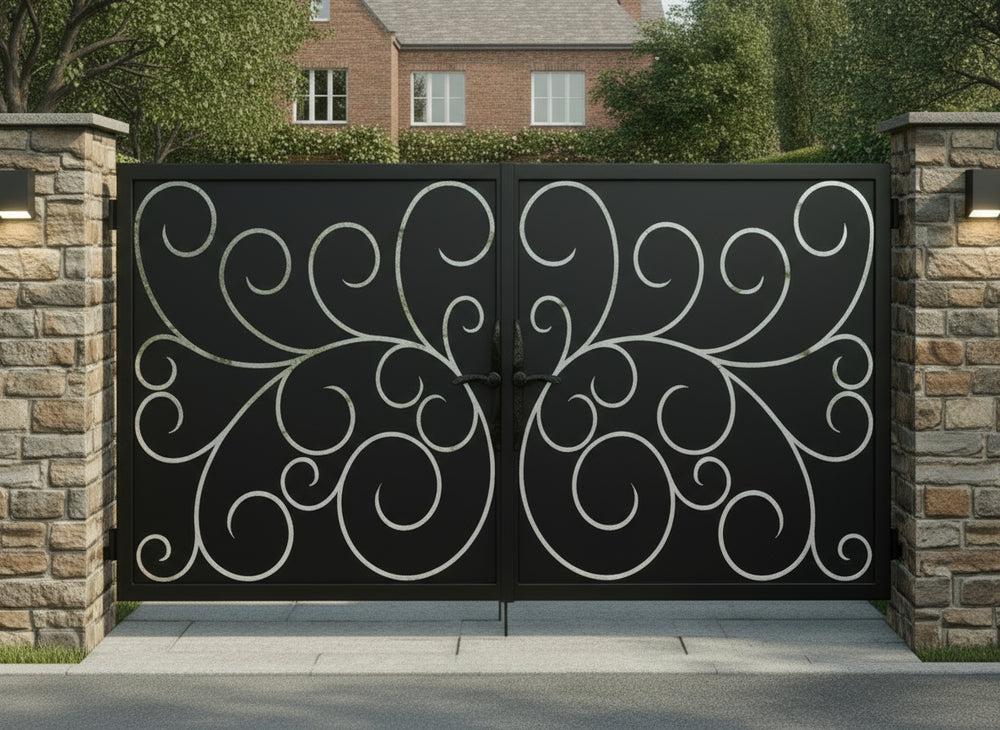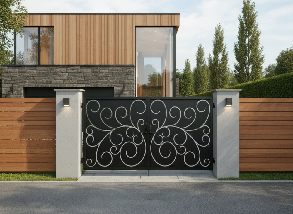 A bold fusion of symmetry and motion, Silver Swirl Gate features mirrored white scrollwork over a matte black steel canvas. The swirling design evokes stylized butterfly wings or floral flourishes, creating a dynamic visual rhythm that feels both modern and timeless. Flanked by minimalist concrete pillars and warm horizontal wood fencing, this gate is ideal for contemporary homes that value contrast, craftsmanship, and curbside elegance.