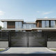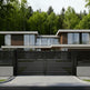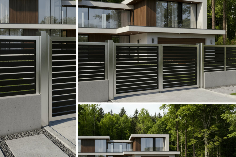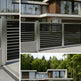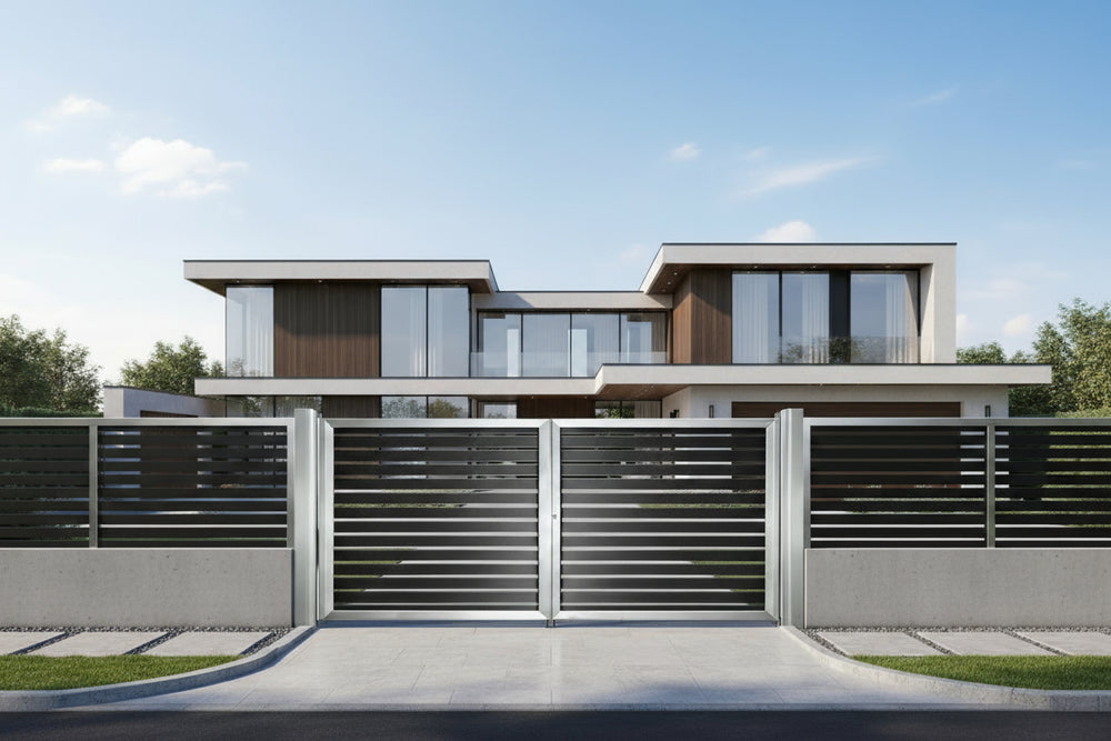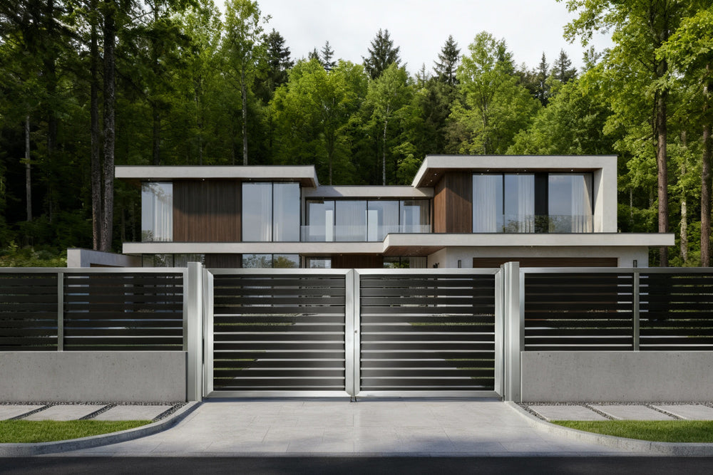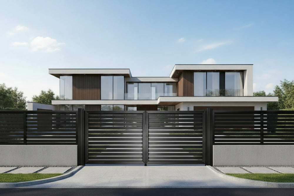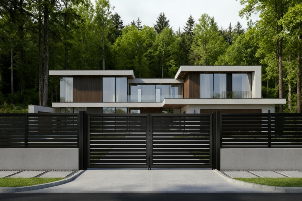 horizontal slat driveway gate, steel or aluminum gate, modern residential entrance, Canadian custom gate, Taimco architectural gate, minimalist estate gate, lightweight aluminum gate, urban gate design