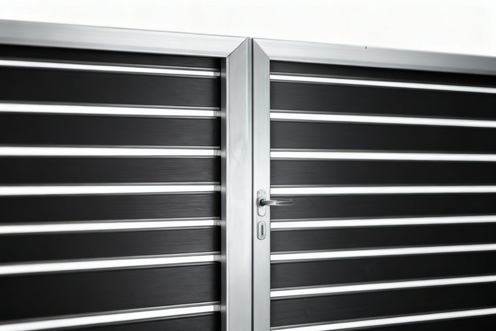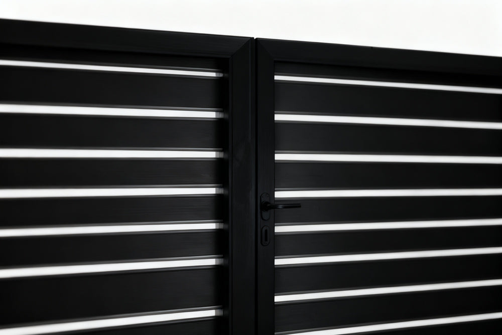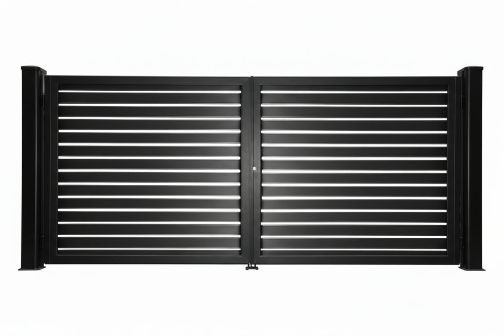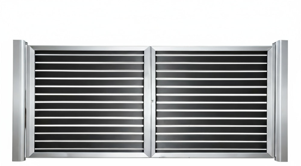 A gate that adapts to your vision. Silverline Horizon features dual swing panels composed of evenly spaced horizontal slats framed in brushed silver metal. Choose between galvanized steel for maximum strength or powder-coated aluminum for lightweight durability and corrosion resistance. The symmetrical layout and central locking seam offer both visual balance and functional security, ideal for modern homes, commercial properties, or gated communities.
