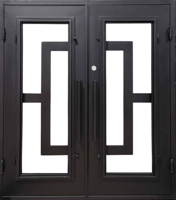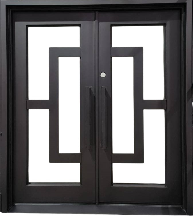 Model IWD 1002 offers an ultra-modern aesthetic with clean lines and minimalist geometry. Its sleek square top frame is anchored by dual vertical panels featuring crisp rectangular cutouts, creating contrast and visual rhythm. The prominent center handle adds sculptural presence, making this design ideal for contemporary builds and commercial applications that embrace architectural clarity. Built for durability and designed to make a statement, this entryway is where modern form meets forged strength.
