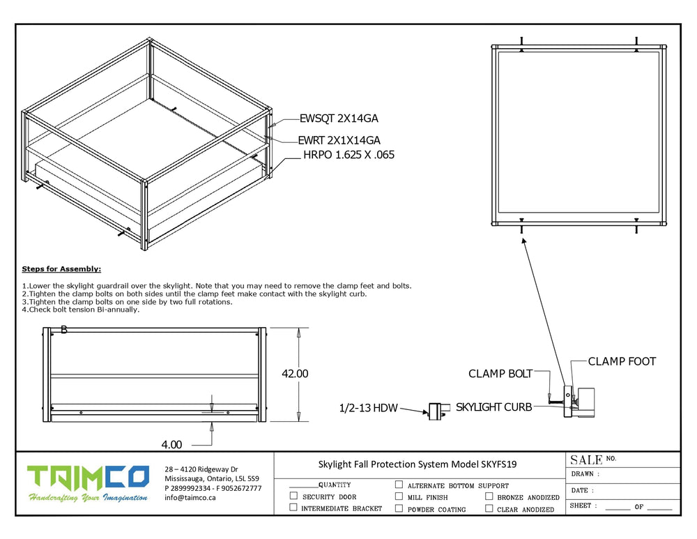 The Non-Penetrating Skylight Guardrail is an innovative solution designed to safeguard skylights without compromising aesthetics or functionality. This system surrounds the skylight with a 42” high barrier that compression fits against the skylight curb, ensuring maximum safety while maintaining a clear view. Ideal for building owners and architects who prefer an unobtrusive safety solution, this guardrail meets all applicable OSHA standards.