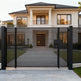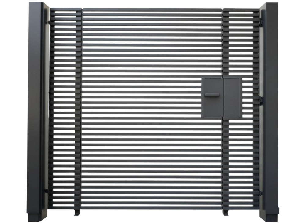horizontal slat mailbox man door, modern metal gate with mail slot, secure residential entry, Canadian custom gate, Taimco contemporary passage door, manual operation estate gate