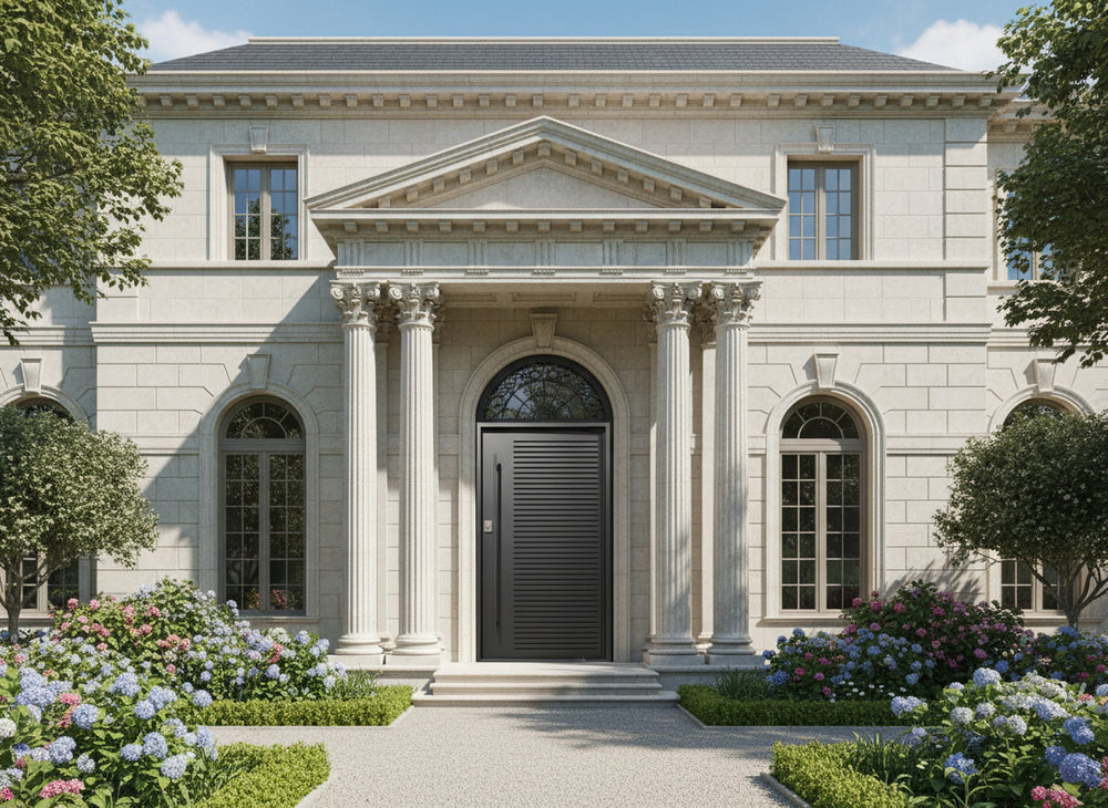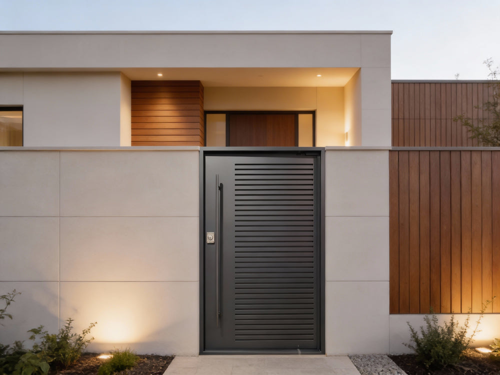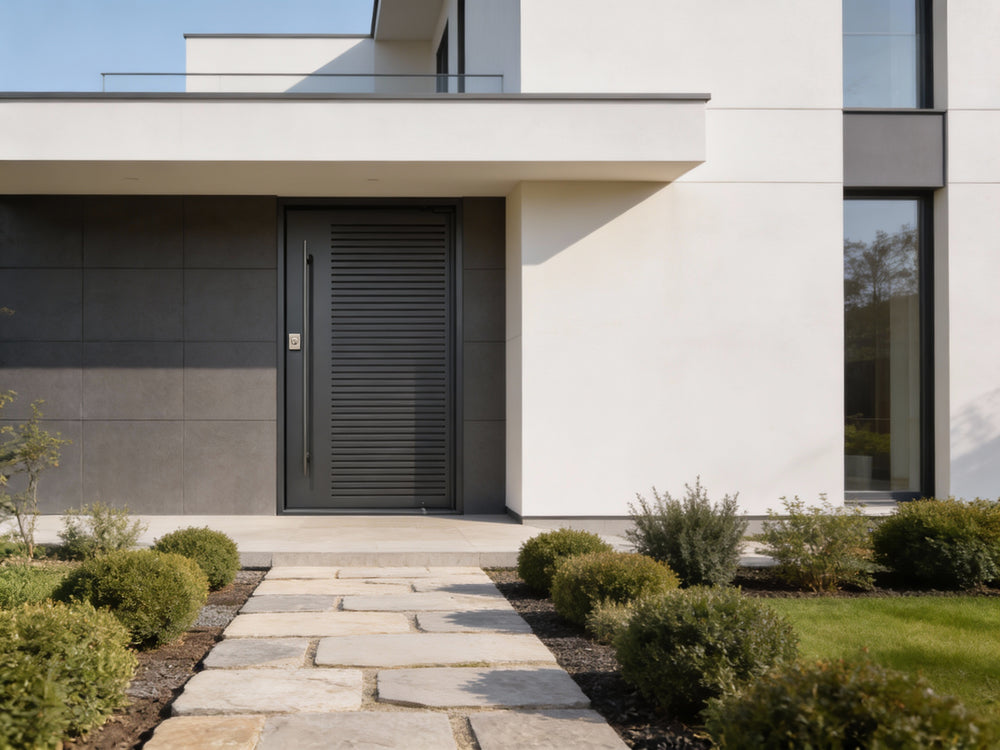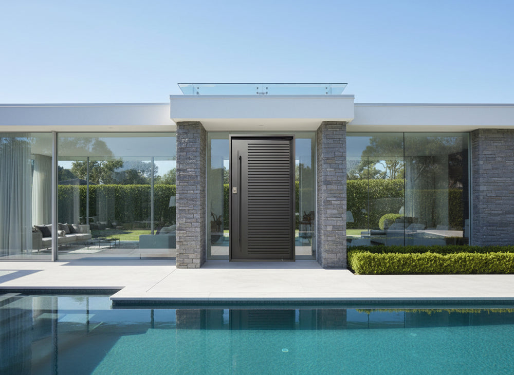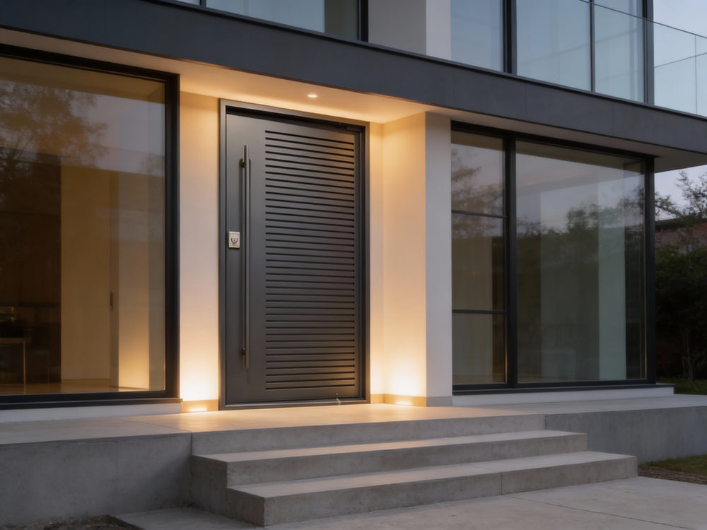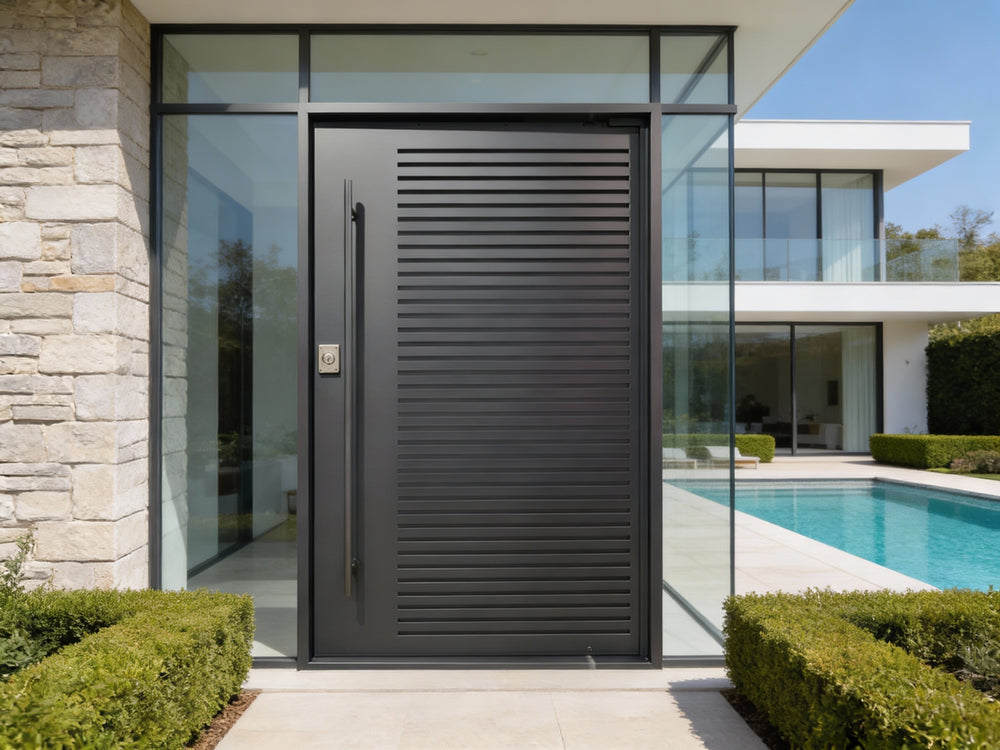 A masterclass in minimalist industrial design, this solid steel door features clean horizontal slats across a matte black powder-coated surface, creating a bold and modern look. Engineered for durability and style, it is perfect for residential and commercial entryways requiring visual impact and enhanced security.