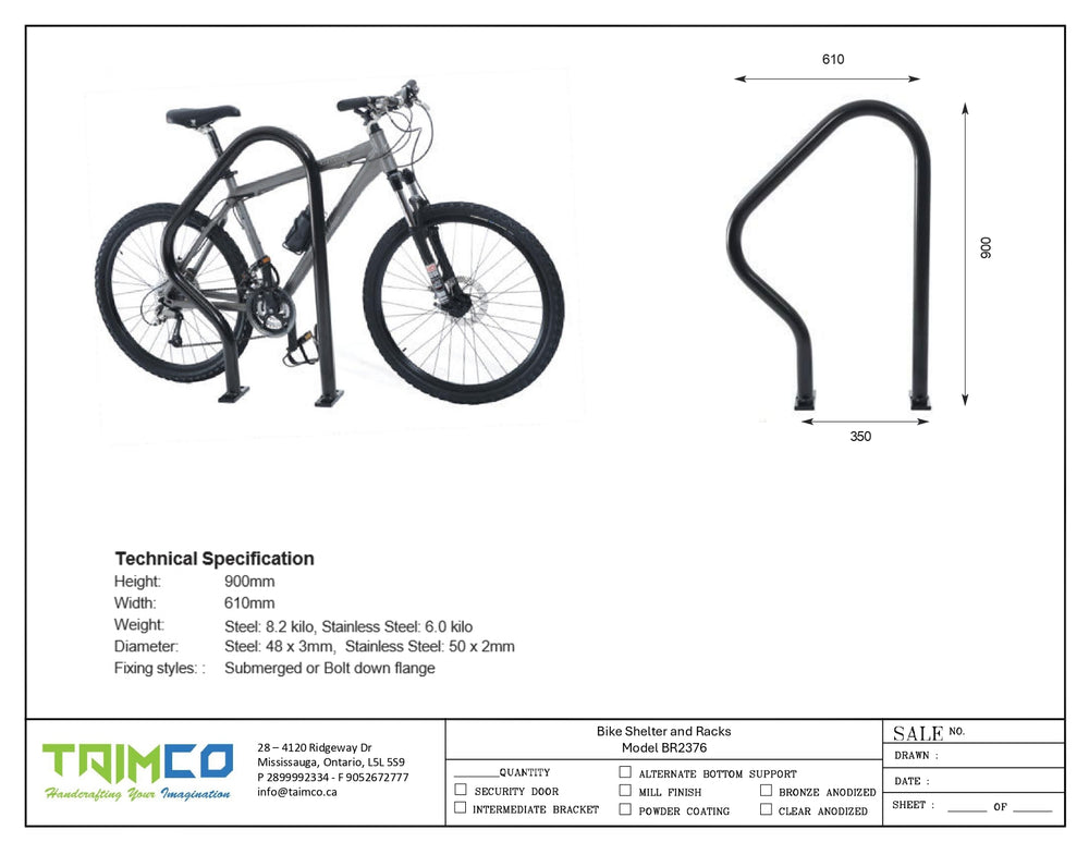 TAIMCO is a variation of the Rack with a touch of flair. Its graceful shape allows bicycles to be parked without twisting. it is offered in heavy-duty, round and square tubing.