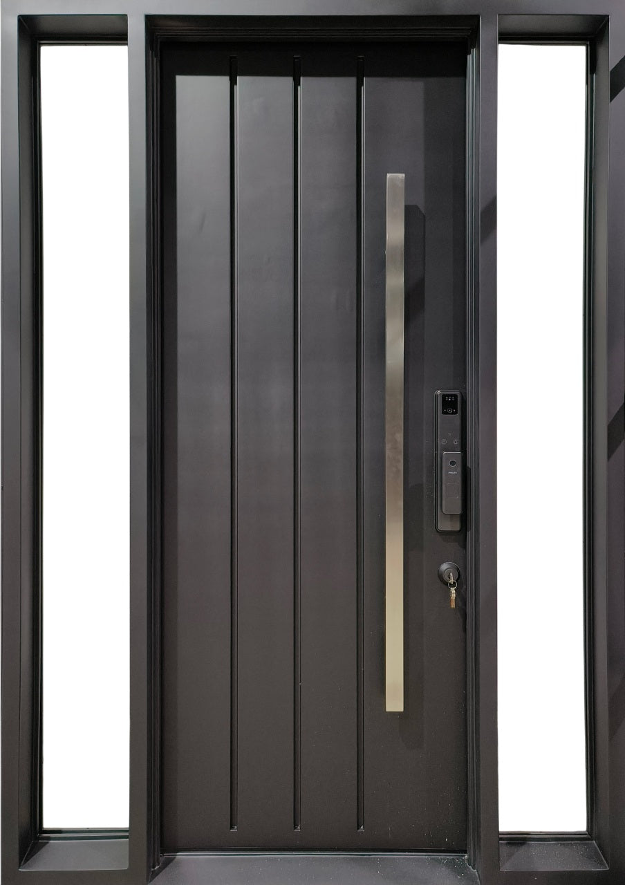 Blends modern architecture with intelligent security. Its vertically paneled matte black face projects minimalism and durability, while dual frosted-glass sidelights soften the silhouette with symmetrical elegance. A full-length metallic pull handle and electronic keypad locking system bring functional sophistication—perfect for homes or commercial properties prioritizing security and design.