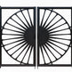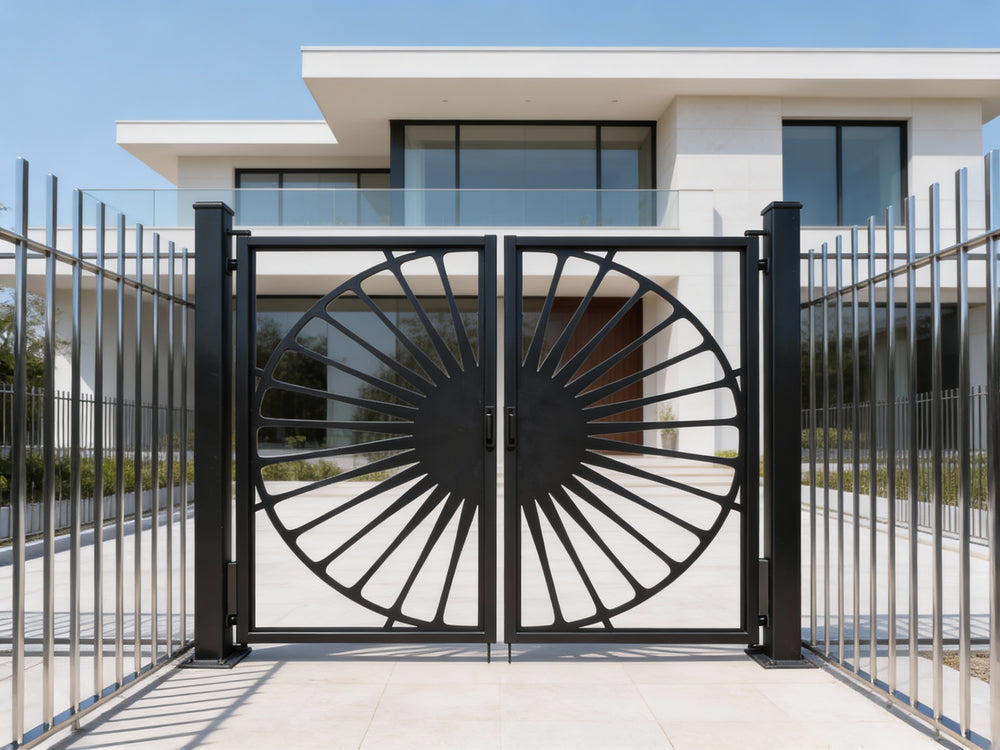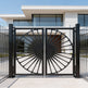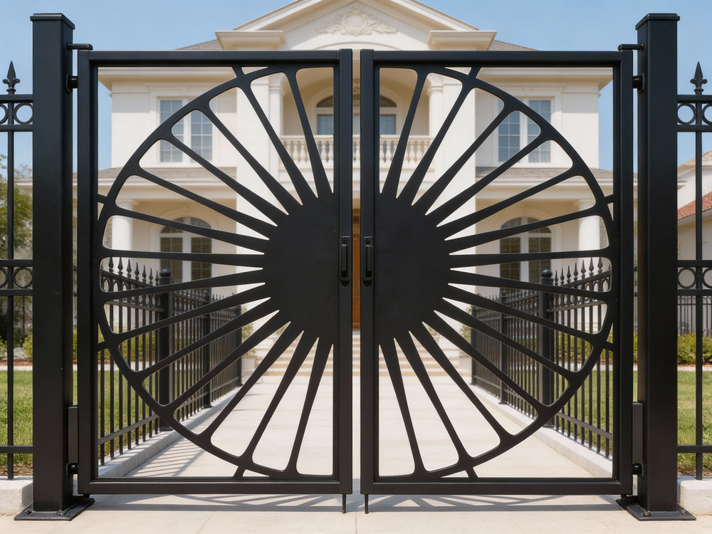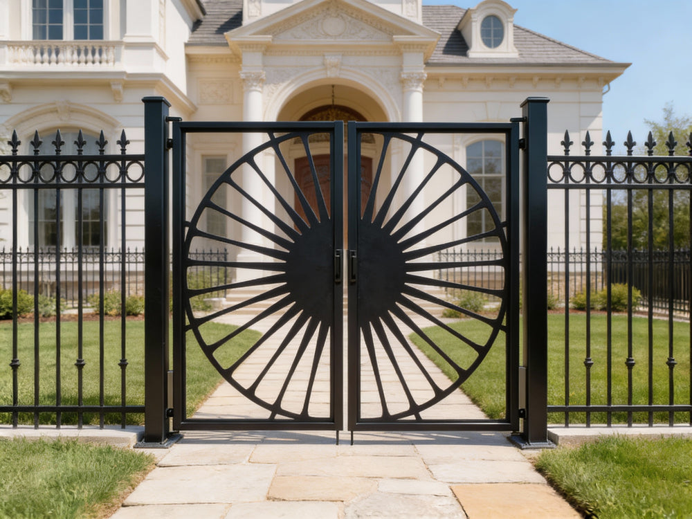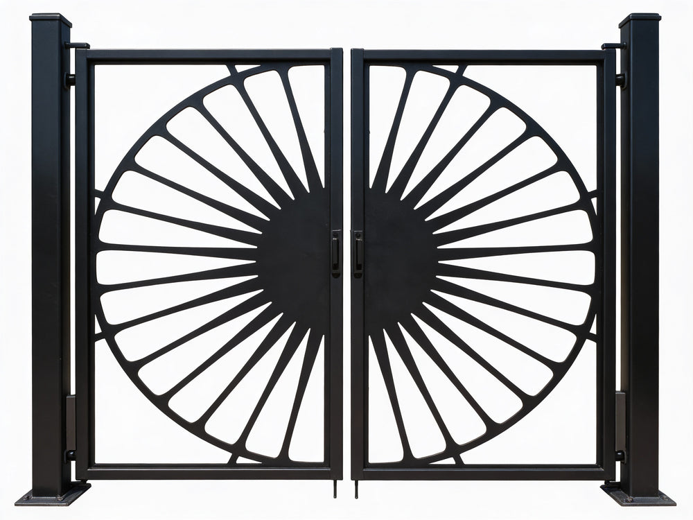 A door that radiates warmth and refinement. Solarose Passage features two symmetrical panels framed in matte black, each showcasing a central circular medallion with radiating bars that evoke a stylized sunburst. Floral accents soften the geometry, while ornamental scrolls and pointed finials crown the composition. Ideal for estate entries, landscaped walkways, or classical transitions, this man door blends solar symbolism with secure craftsmanship.