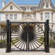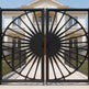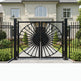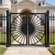 sunburst floral man door, ornamental wrought iron gate, circular medallion garden entry, Canadian custom gate, Taimco Solarose Passage model, manual operation decorative door