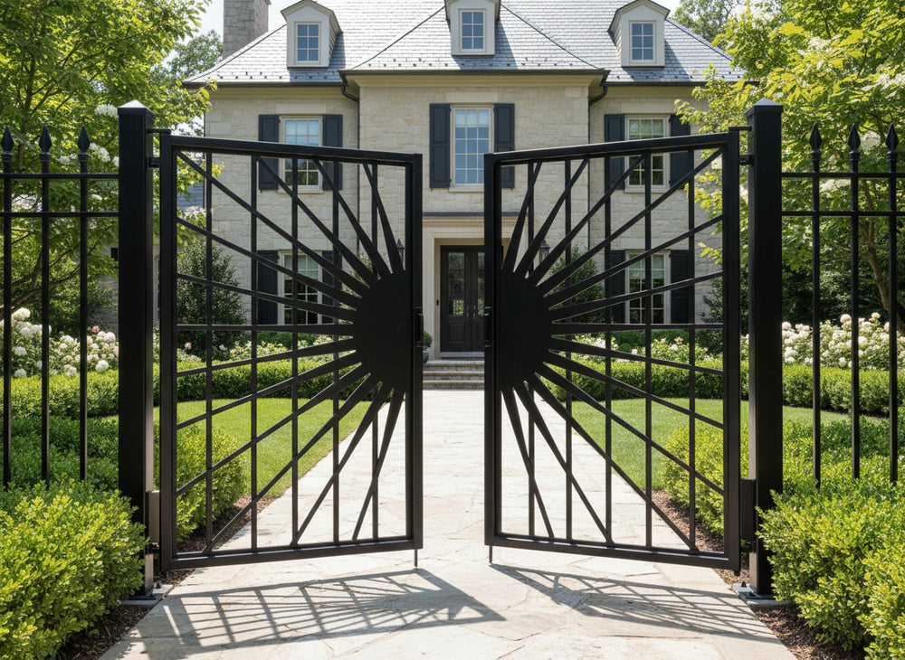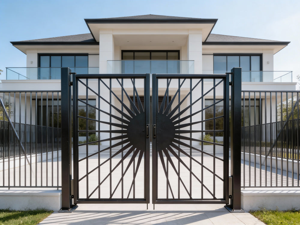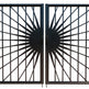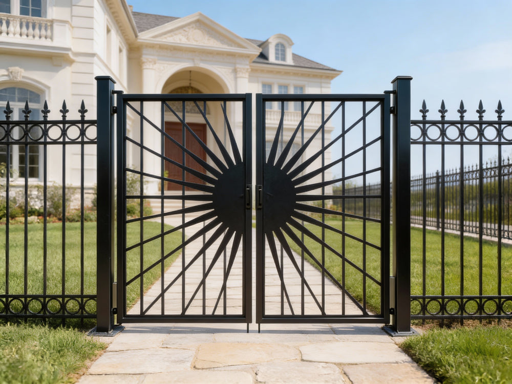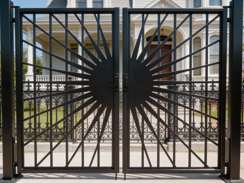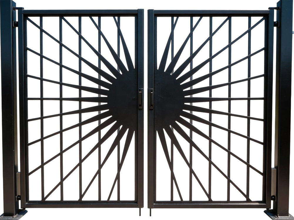 A door that radiates prestige and precision. Solflare Luxe features two symmetrical panels framed in matte black, each showcasing a central circular medallion with radiating bars that evoke a stylized sunburst. The surrounding fencing echoes the theme with pointed finials and circular accents, creating a cohesive architectural rhythm. Ideal for estate entries, landscaped walkways, or classical transitions, this man door blends solar geometry with secure craftsmanship.