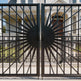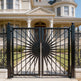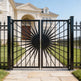 sunburst medallion man door, ornamental wrought iron gate, circular symmetry garden entry, Canadian custom gate, Taimco Solflare Luxe model, manual operation decorative door