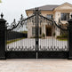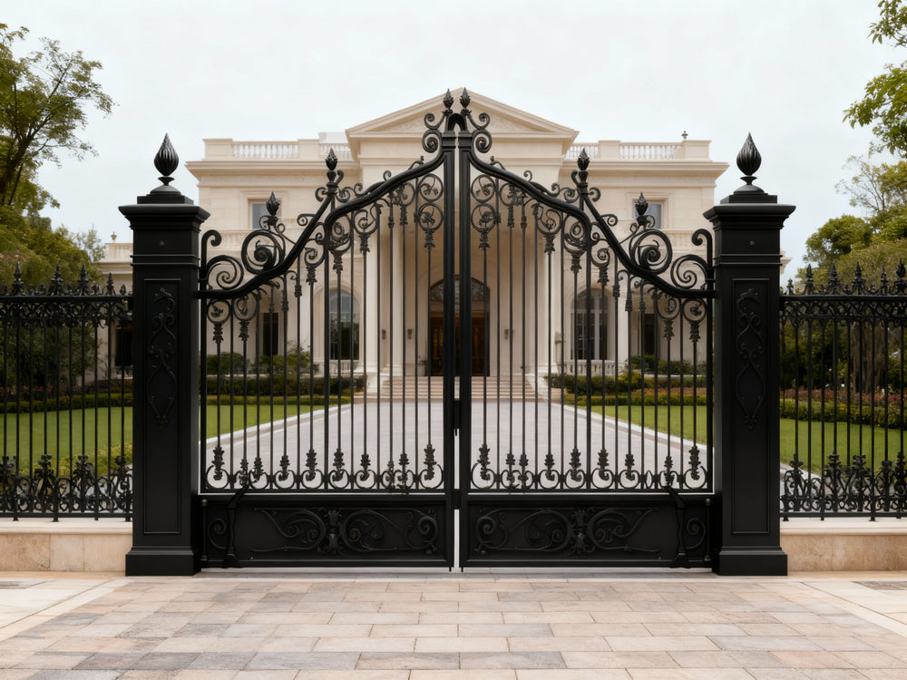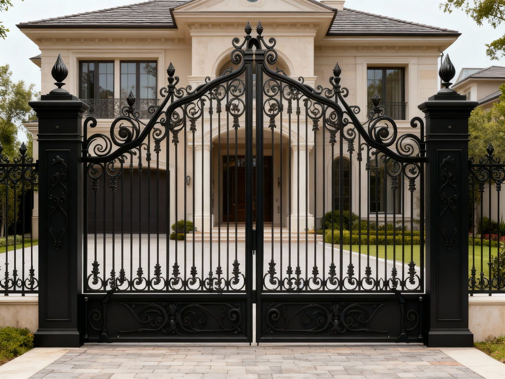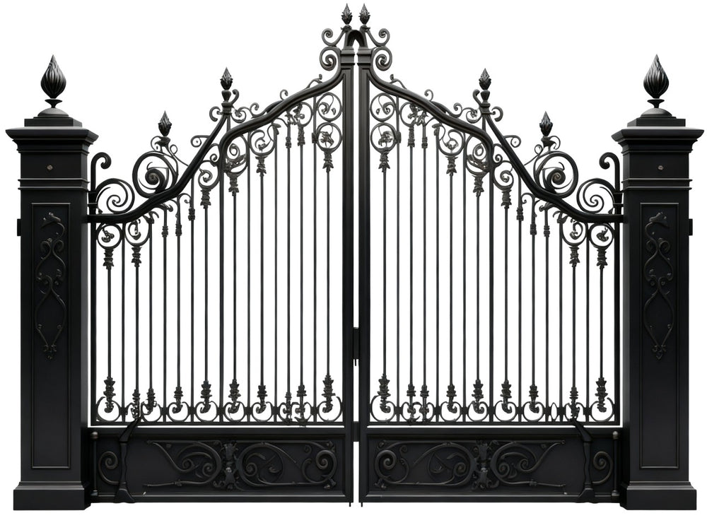 A gate that guards with grace and gravitas. Spearcrest Bastion features dual swing panels with vertical bars, floral scrollwork, and a central crest flourish. The arched top culminates in a decorative finial, while spear-like tips line the upper rail, evoking strength and ceremonial dignity. Flanked by square stone pillars topped with pointed finials, this gate is a statement of architectural authority—perfect for entrances that must impress before a word is spoken.