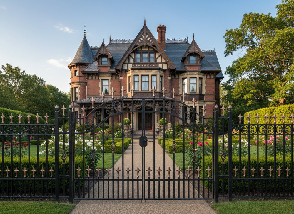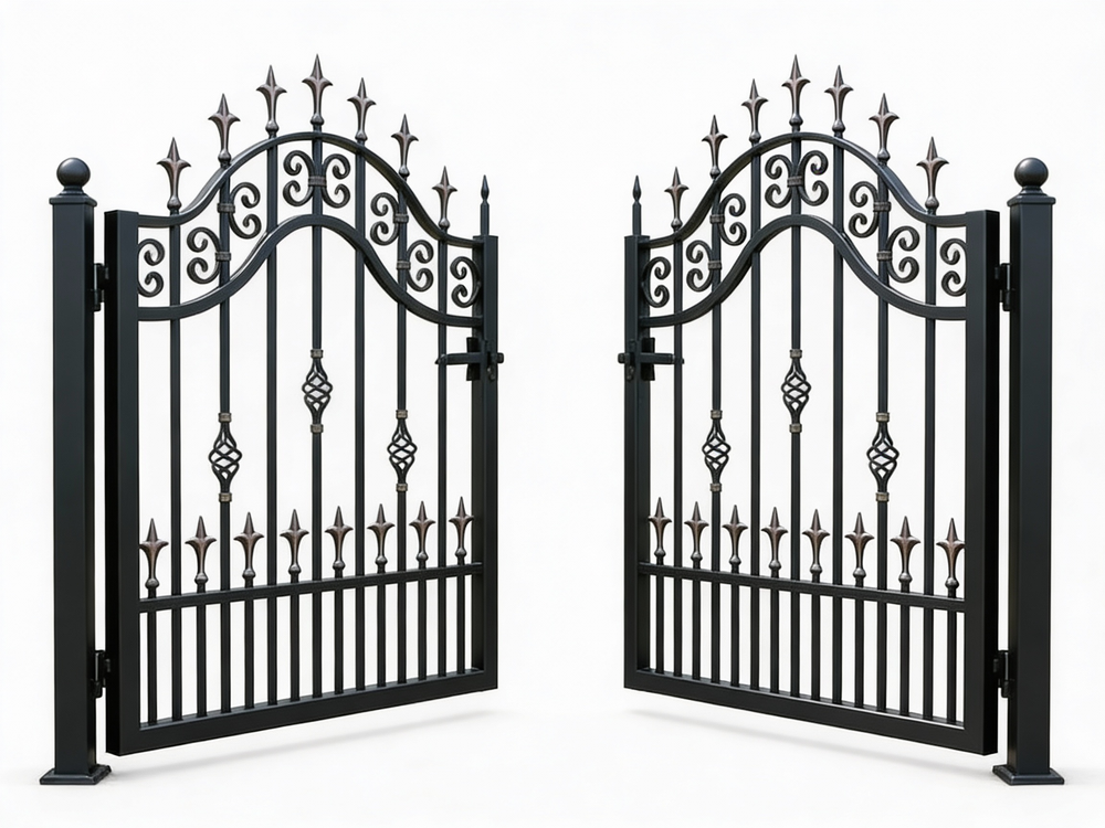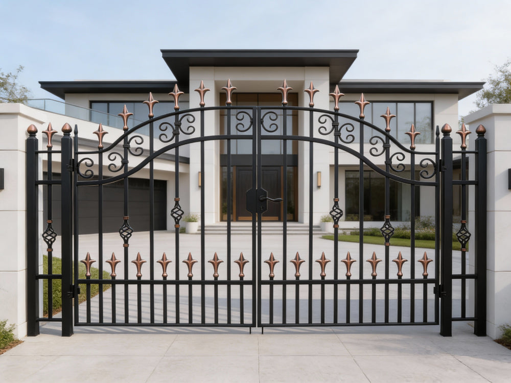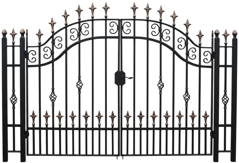A door that commands with elegance. Spear crest Passage features two symmetrical panels framed by vertical bars topped with alternating black and bronze spear finials. The central section showcases diamond-shaped latticework and ornamental scrolls, while the arched top adds architectural lift. Designed for garden entries, residential walkways, or estate transitions, this man door blends classical strength with decorative finesse.