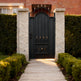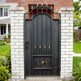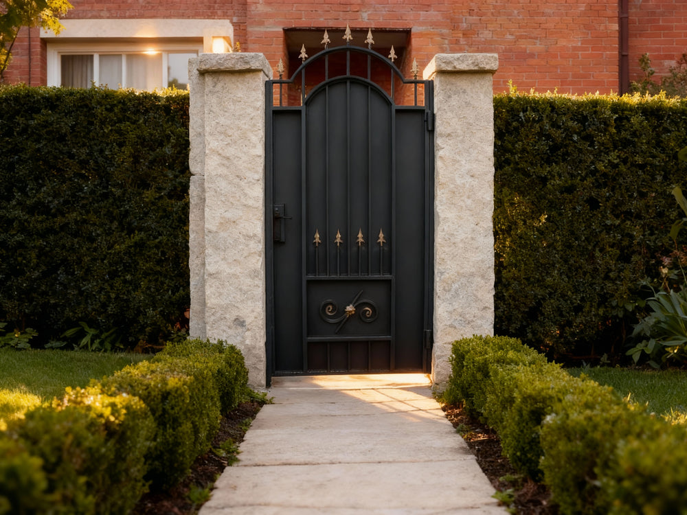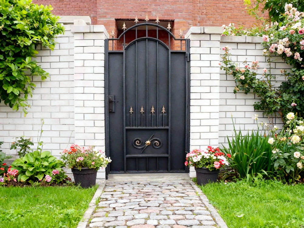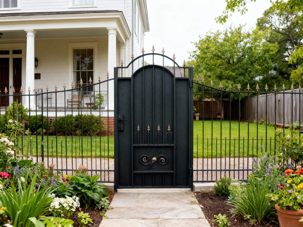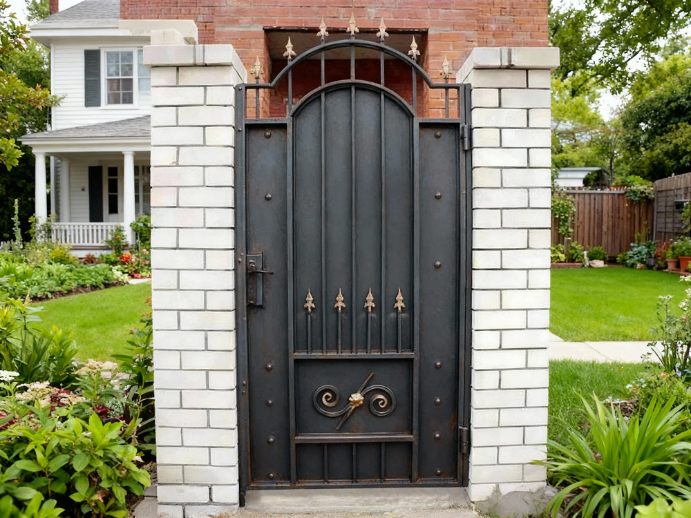 A door that blends regal symbolism with fortified elegance. Spearcrest Passage features a tall arched frame with vertical bars crowned by gold-colored spearhead finials. The lower section includes symmetrical scrollwork and a central gold floral accent, offering both security and ornamental richness—ideal for estate entries, garden transitions, or architectural passages that demand prestige and protection.
