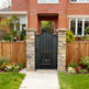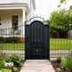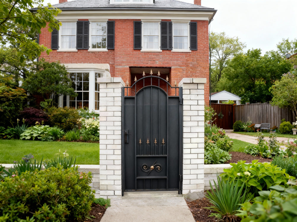 wrought iron spearhead man door, gold finial metal gate, embossed scroll garden entry, Canadian custom gate, Taimco regal passage door, manual operation estate gate