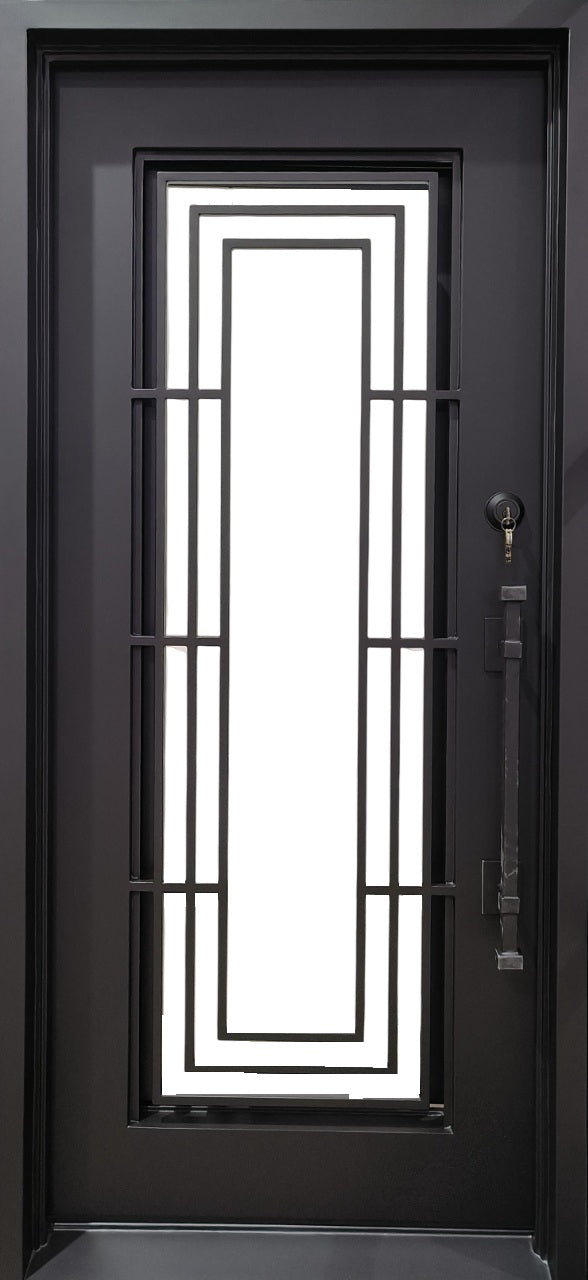 Make a bold design statement with Model IWD 949, a square-top wrought iron single entry door built for modern architecture. Featuring a centered vertical glass panel surrounded by symmetrical rectangular framing, this minimalist design offers clean visual rhythm and structural resilience. The matte black finish enhances its sleek lines, while dual-pane frosted glass provides light filtration and privacy. Crafted in Canada from hot-dipped galvanized steel and sealed for all-season weather resistance, this door pairs contemporary style with dependable durability.