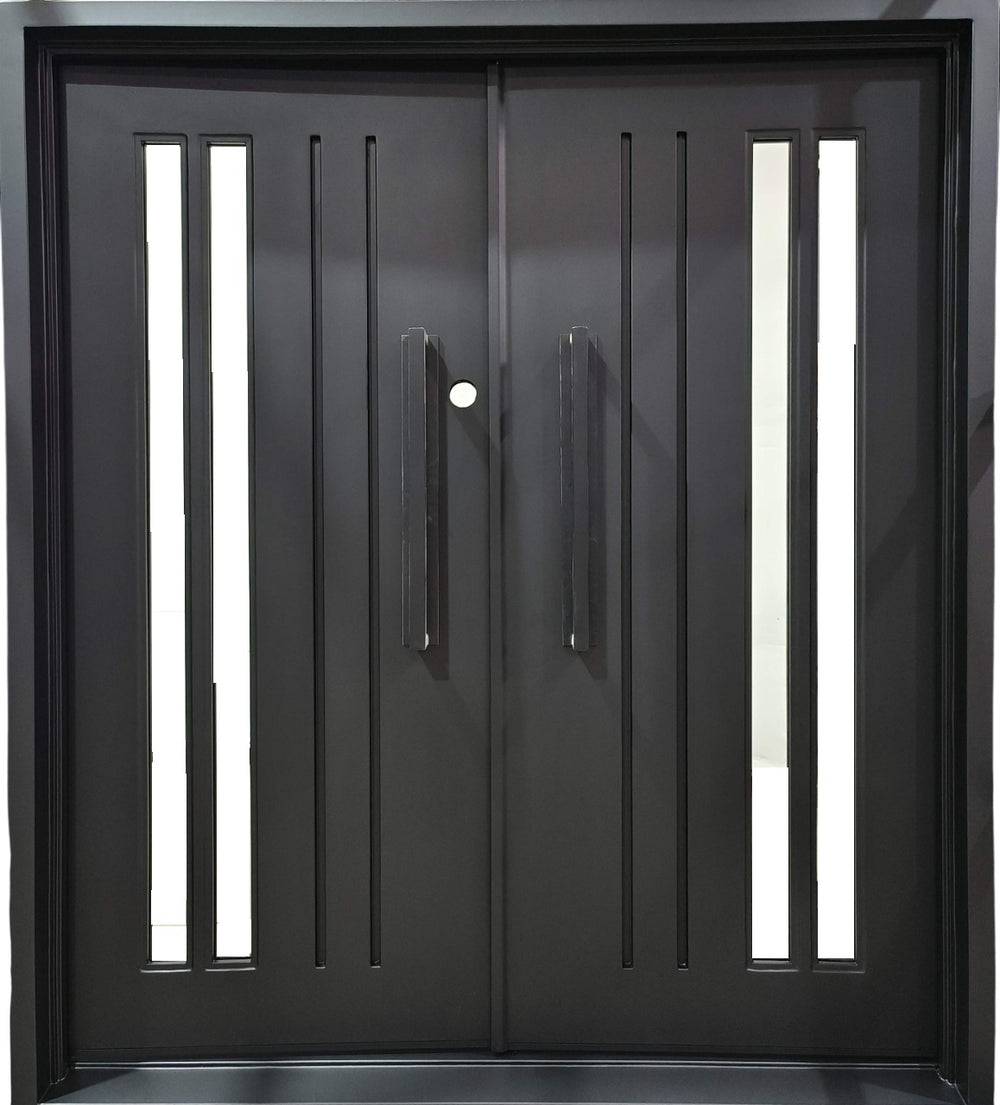 Introducing Model IWD 926, a sleek square-top wrought iron entry door built for strength, simplicity, and modern style. Featuring a solid kickplate base and vertical frosted glass panels encased in ornamental metal framing, this single door provides both privacy and elegance. Forged from galvanized steel and sealed with matte black powder coating, it offers exceptional resistance to corrosion and weather. The door arrives pre-hung, pre-drilled, and insulated—perfect for homeowners seeking a minimalist design with long-term performance benefits.