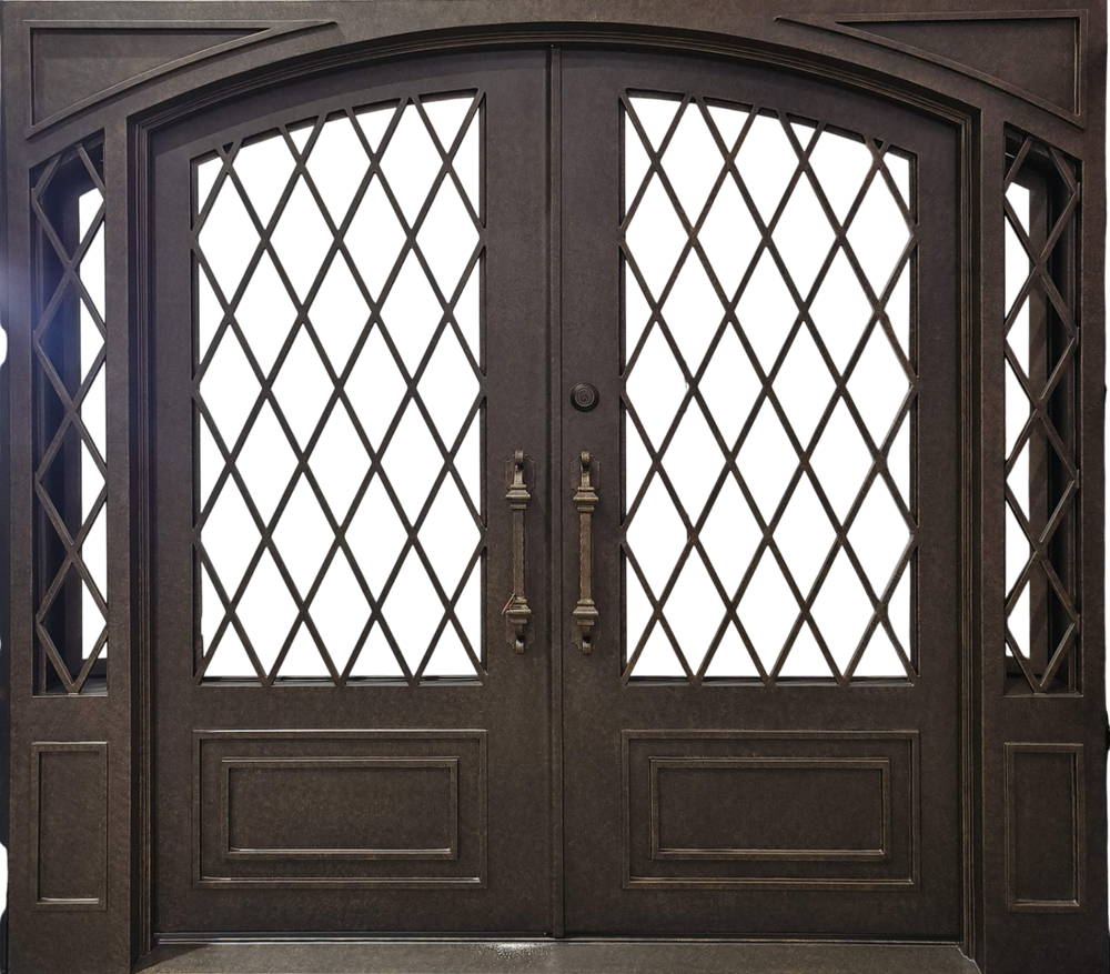 Upgrade your home’s entrance with Model IWD 933, a square-top wrought iron double door featuring vertical scroll panels and a transom window. Built in Canada using galvanized steel and powder-coated matte black, this decorative entry system is ideal for homeowners seeking custom iron doors, double entry doors with transoms, vertical scroll black steel doors, and energy-efficient metal door solutions with classic symmetry