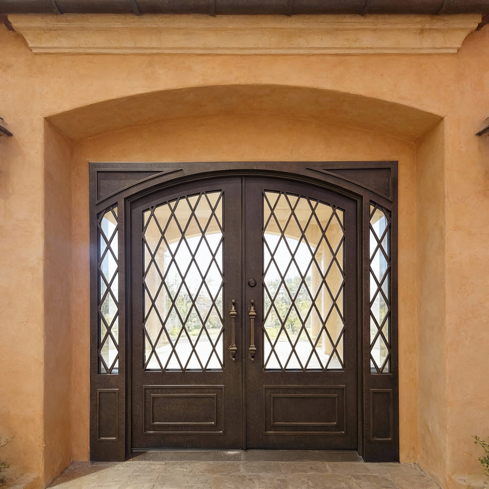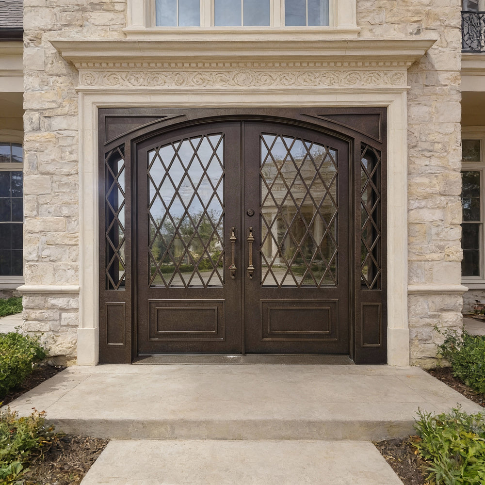 Make a bold and elegant statement with Model IWD933, a handcrafted wrought iron double door designed with vertical scroll panels and topped with a clear glass transom. This Canadian-made unit blends ornamental artistry with modern durability, built from hot-dipped galvanized steel and sealed in a matte black powder coating. Dual-pane glass panels offer controlled lighting and privacy, while the square-top silhouette adds timeless symmetry to any architectural style. Engineered for performance, this pre-hung and insulated entry system is ideal for upscale homes seeking visual impact and year-round efficiency.