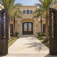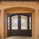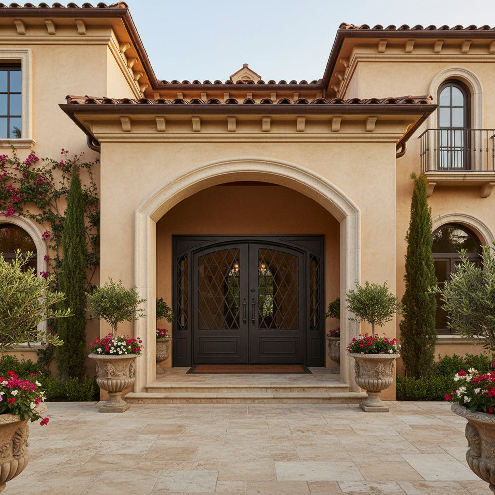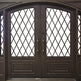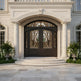 - Design: Square-top double doors with vertical scrollwork and top transom window