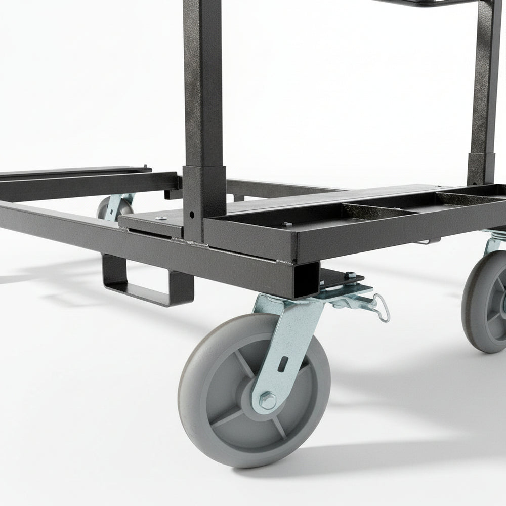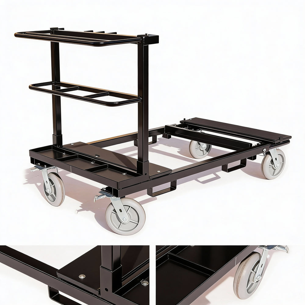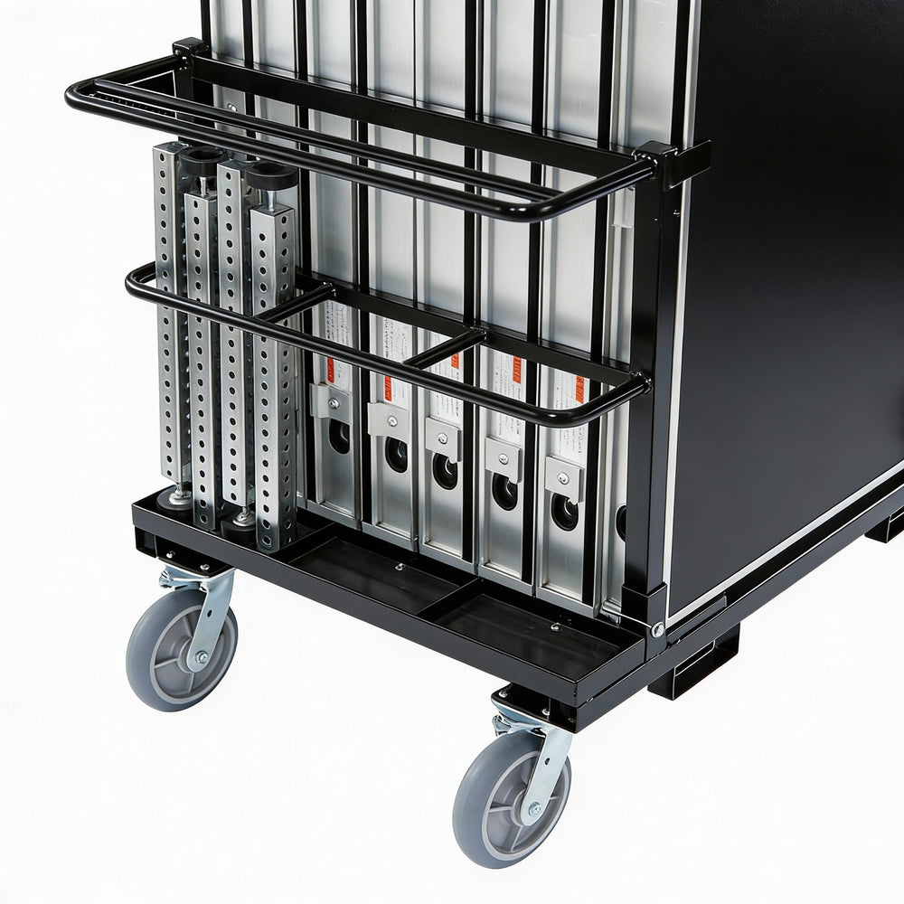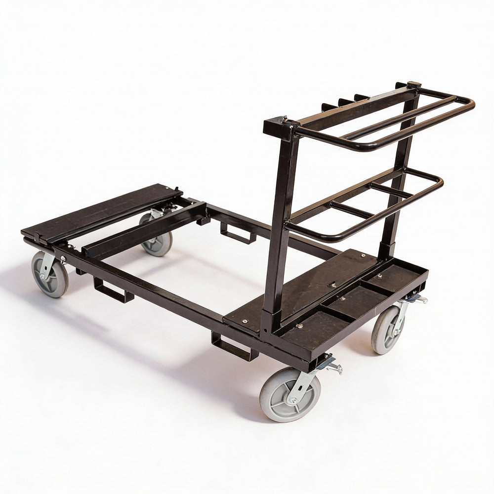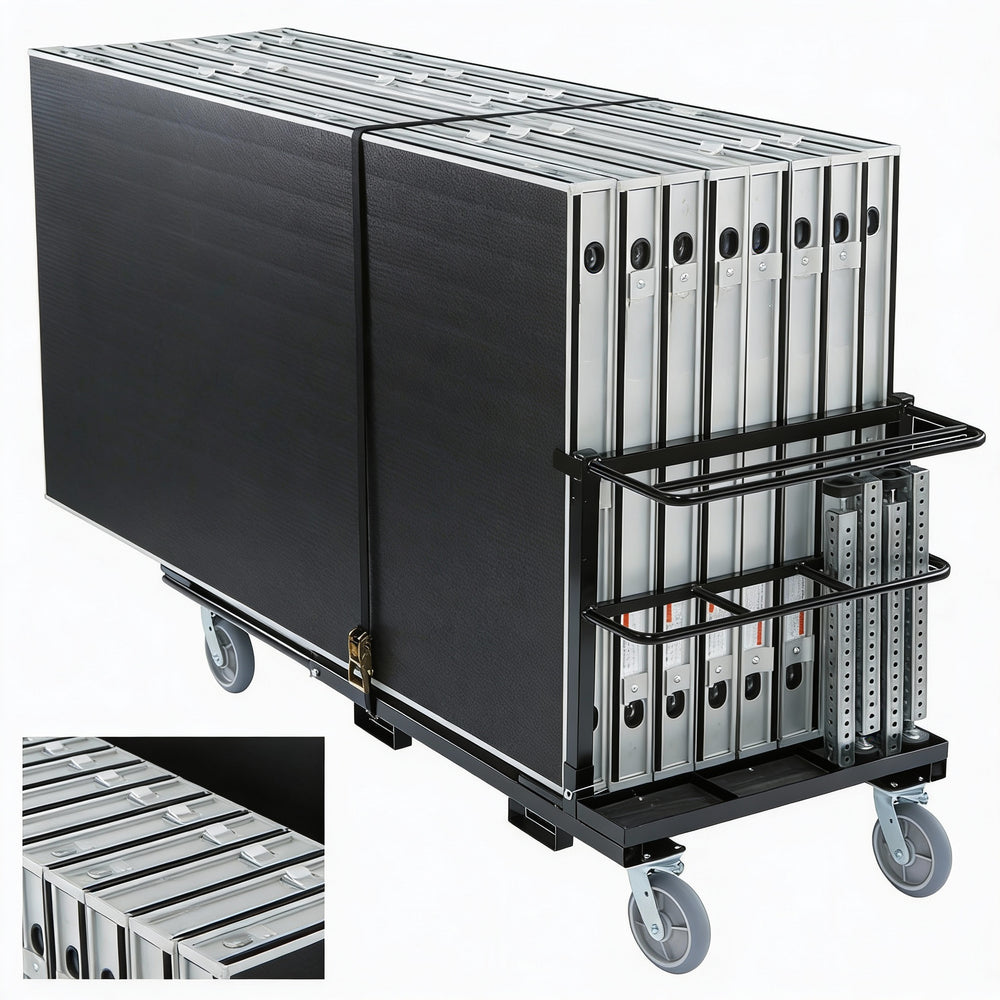 - Carts are adjustable to fit Qty (8) of the 4' decks or Qty (8) of 8' decks with additional compartments for storing legs and other accessories.