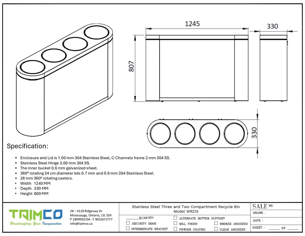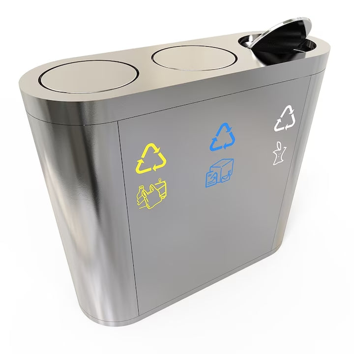 The TAIMCO WR213 offers a contemporary solution for eco-friendly waste separation in public spaces. Available with 2, 3, or 4 compartments (each 40L), this sleek recycling bin is crafted from high-quality stainless steel.