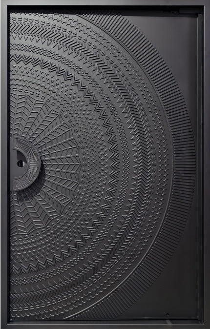 - Full iron panel showcasing concentric circles, triangles, and zigzag motifs formed using deep metal stamping techniques
