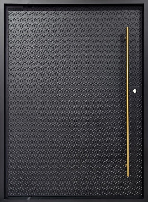 This bold single-panel pivot door features a sophisticated geometric honeycomb texture, created using deep metal stamping technology. The repeating hexagonal pattern is pressed into the surface to add both a tactile dimension and a visually striking, modern appeal—perfect for contemporary entryways or commercial facades.
