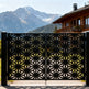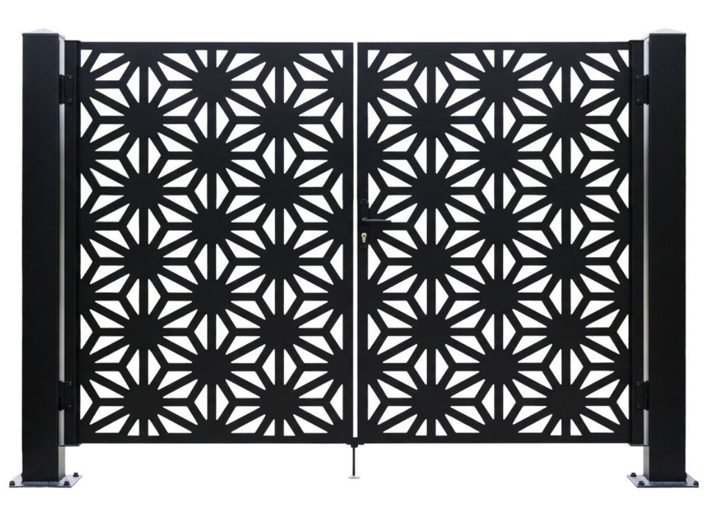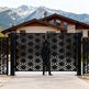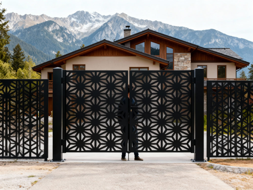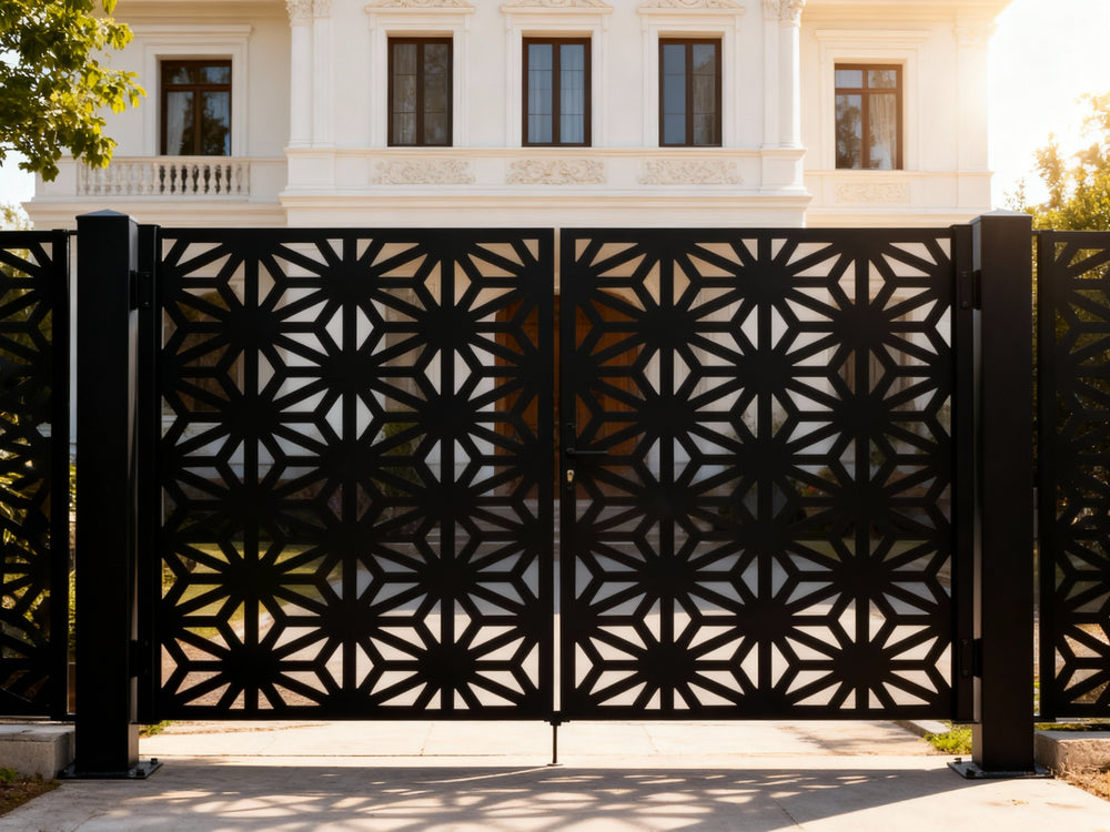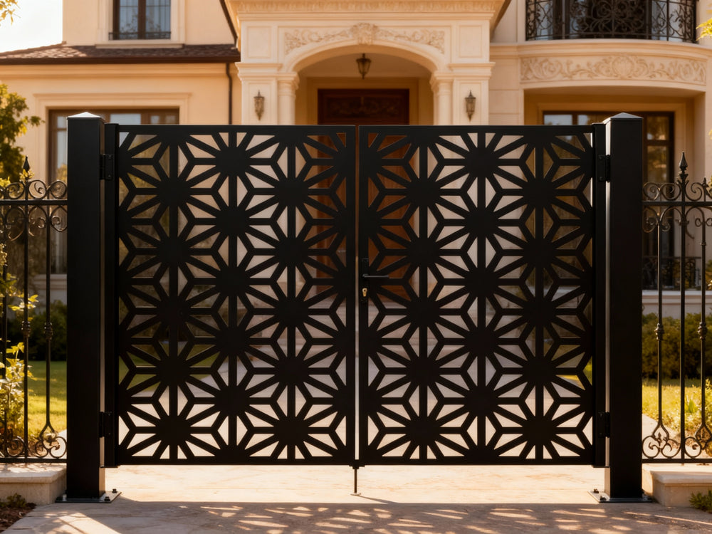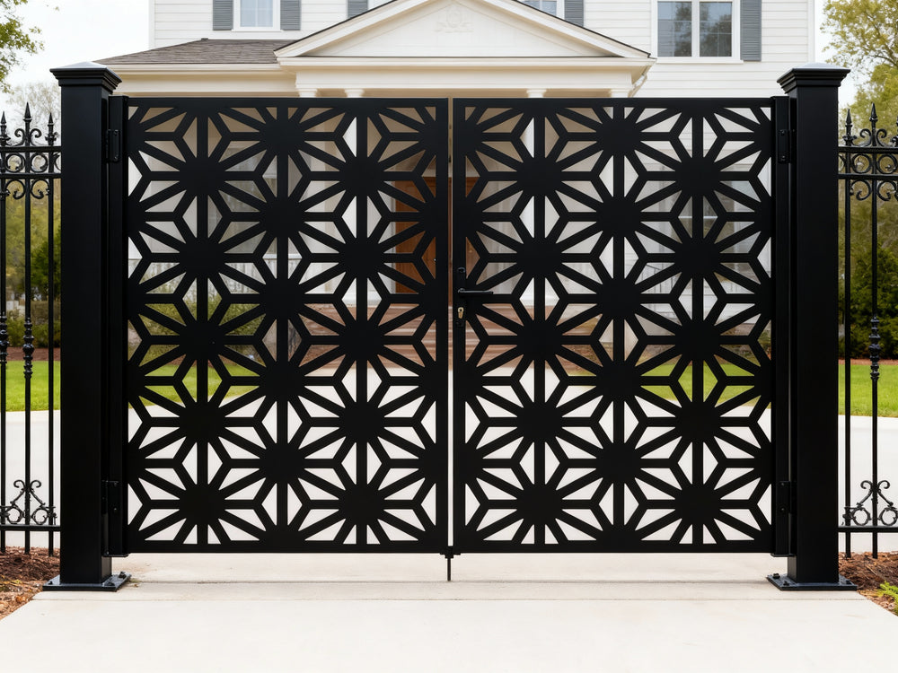 A door that radiates precision. Starveil Passage features two symmetrical panels with repeating starburst motifs formed by triangular and trapezoidal cut-outs. The design creates a dynamic rhythm of light and shadow, offering partial visibility while maintaining privacy and security—ideal for modern estates, artistic entries, or architectural boundaries that blend bold geometry with ornamental strength.
