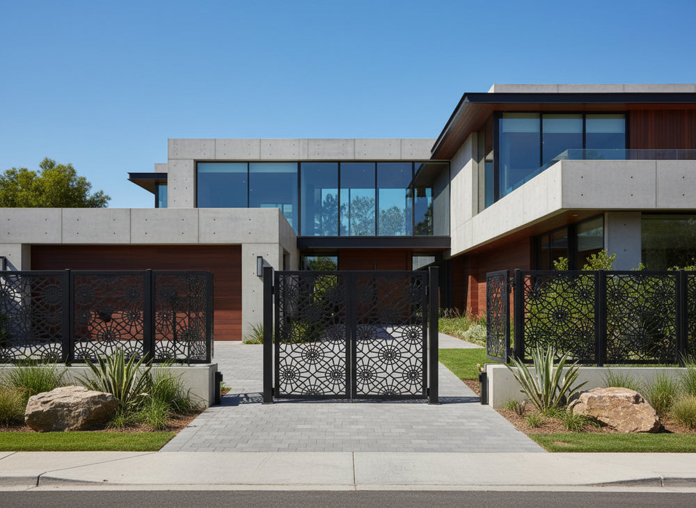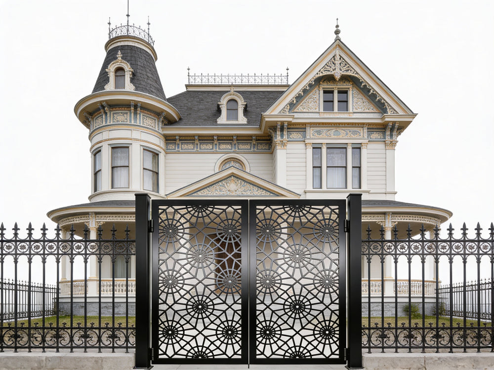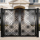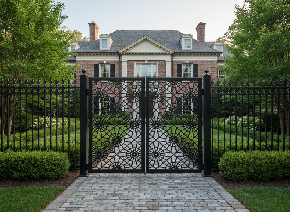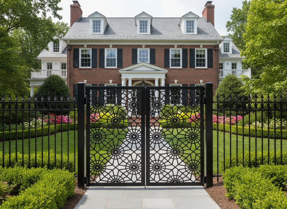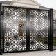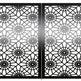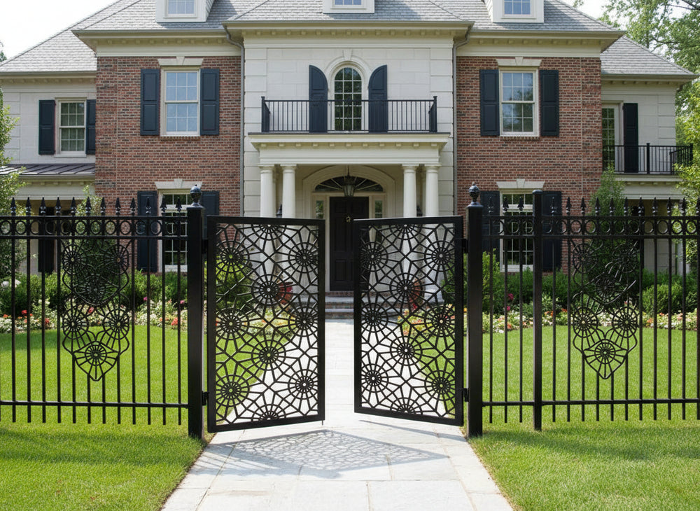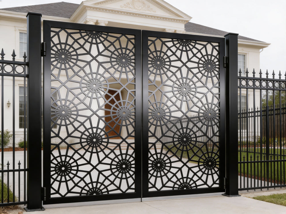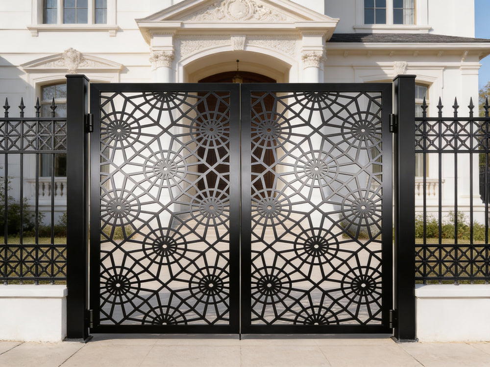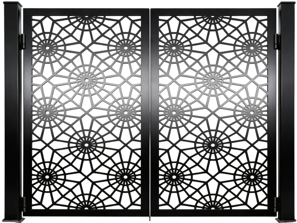 A door that radiates elegance and precision. Starveil Passage features two symmetrical panels framed in matte black, each showcasing a repeating pattern of radial floral motifs—circular starbursts with petal-like extensions—interconnected by angular lines. The design offers partial visibility and ventilation while delivering architectural drama and ornamental charm. Ideal for garden entries, residential walkways, or boutique transitions, this man door blends geometric artistry with secure craftsmanship.