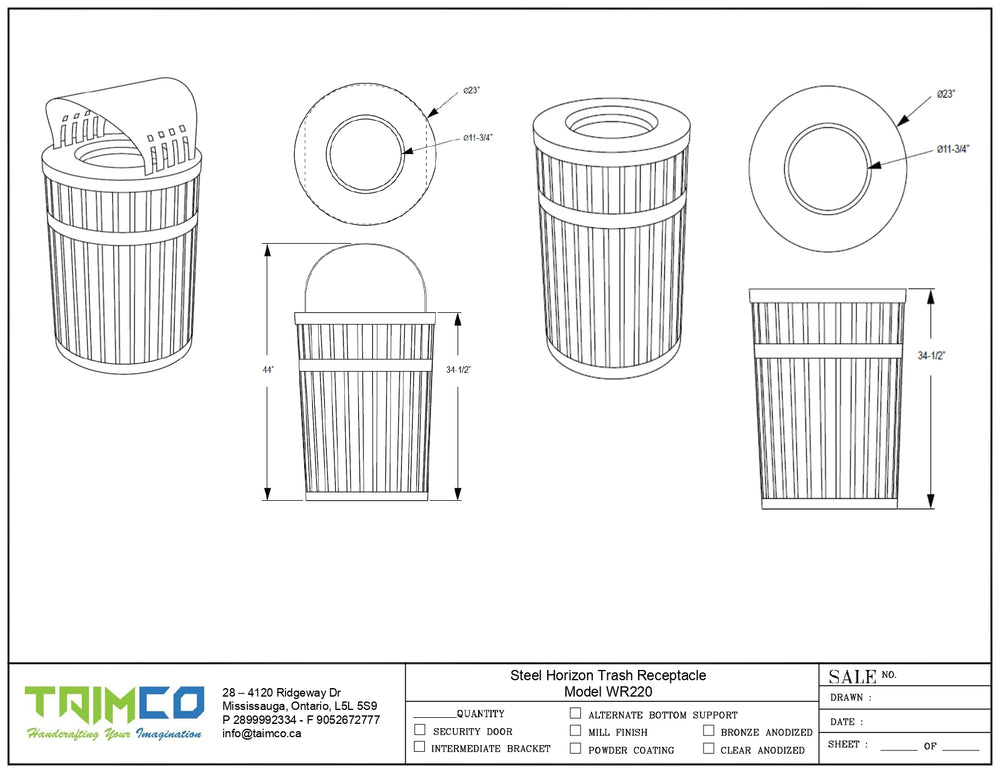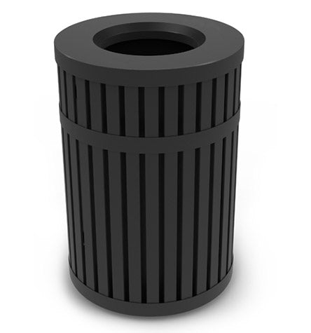 Engineered for durability and functionality, the TAIMCO WR220 Trash Receptacle is designed to improve litter management in parks, city streets, and commercial spaces. With all-steel fabrication, this receptacle offers a long-lasting solution sealed in a corrosion-resistant, weather-proof powder-coated finish for optimal performance in all conditions. The modern vertical slat base accented by sleek horizontal bands ensures an aesthetic appeal that complements any urban or natural environment.