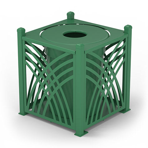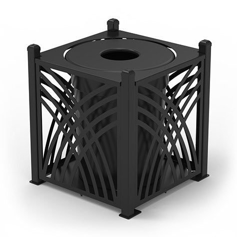 The choice of flat top, rain bonnet, or ash urn lid provides a generous 8” round opening with 360-degree access, allowing for easy disposal while minimizing odors, restricting unwanted pests, and preventing precipitation collection. The removable heavy-duty black plastic liner ensures effortless waste handling.