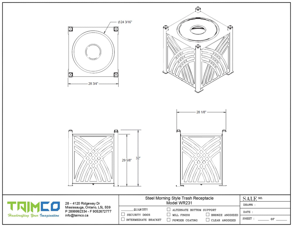 Designed to enhance both functionality and aesthetics, the TAIMCO WR231 Trash Receptacle delivers superior waste management for parks, streets, and public spaces. Featuring a decorative square body design with all-steel construction, this 32-gallon receptacle withstands harsh seasonal conditions while maintaining its modern appeal. A corrosion-resistant powder-coated finish ensures longevity, making it an ideal addition to outdoor or commercial environments.