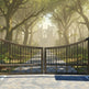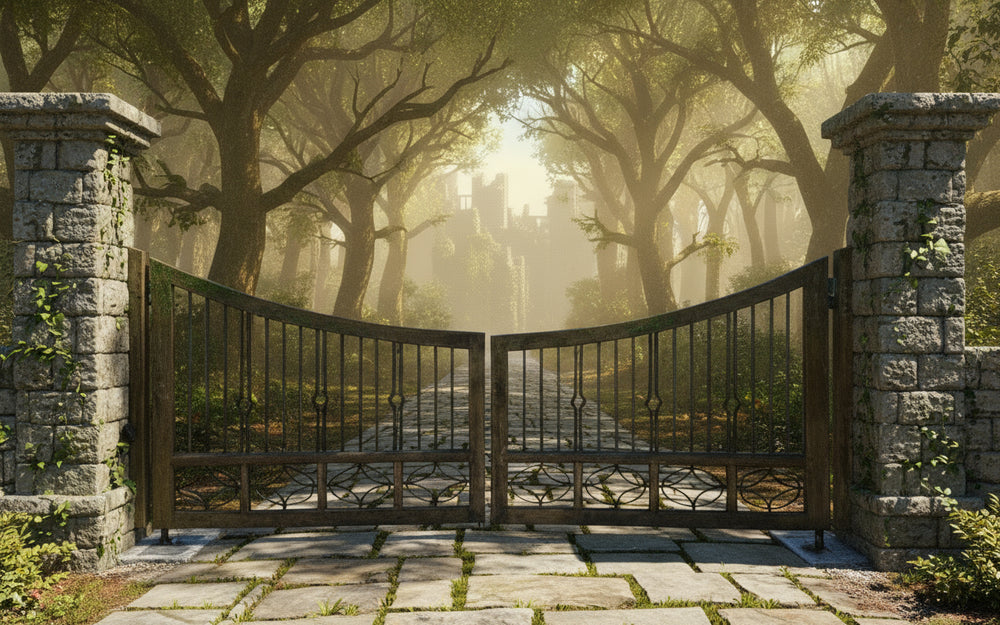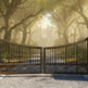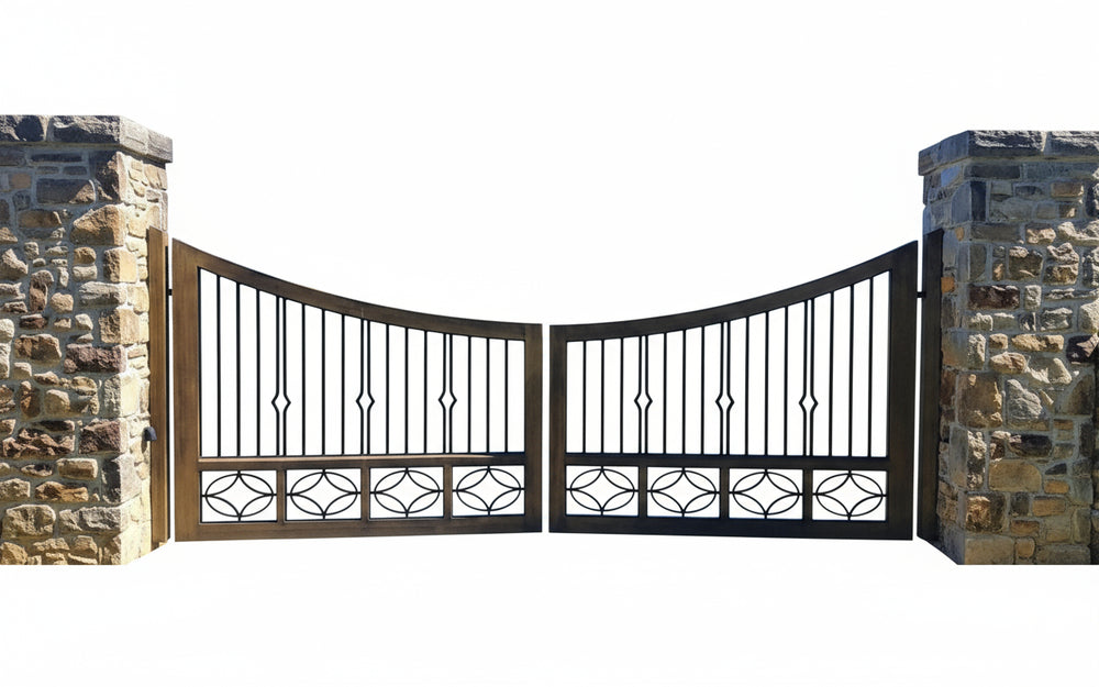 Let your entrance whisper timeless strength. Stoneveil Arch features a graceful downward arch with vertical bars and a lower panel of circular motifs enclosed in rectangular frames. Flanked by irregular stone pillars, this gate offers a grounded, symmetrical presence—perfect for estates that blend rustic textures with refined geometry.