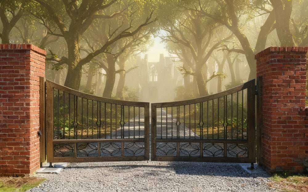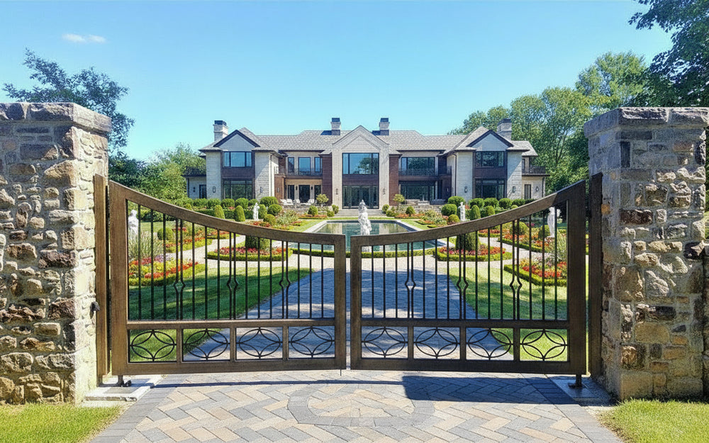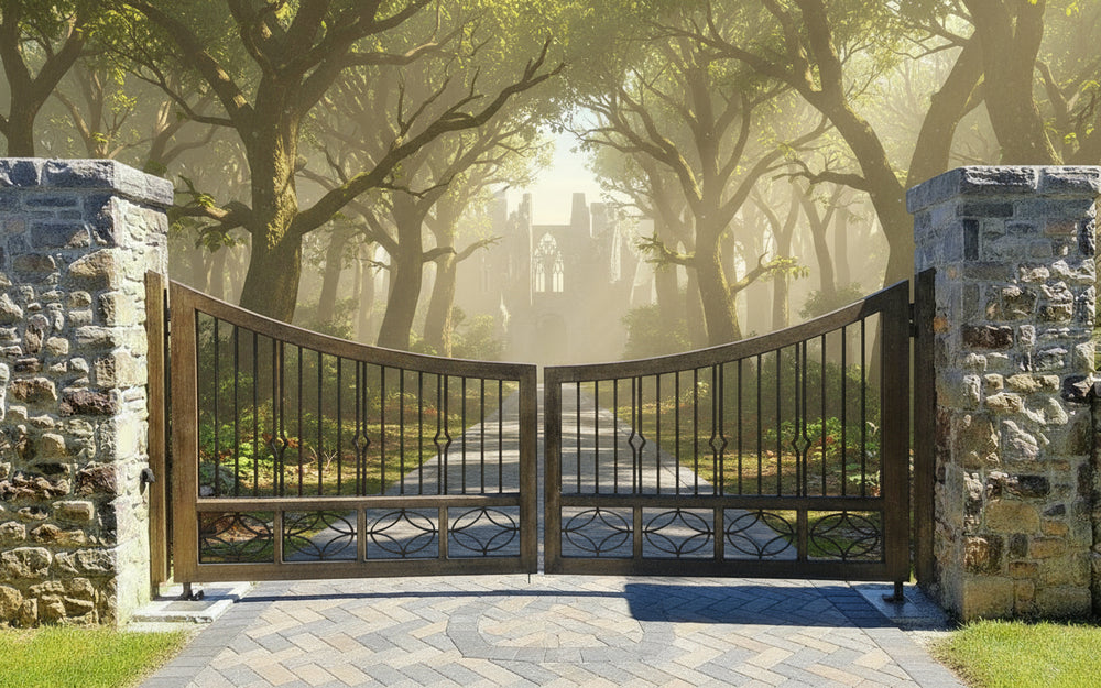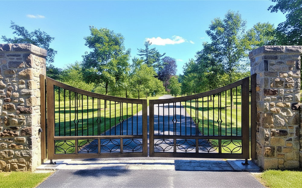 circular motif driveway gate, arched wrought iron gate, custom steel entrance gate, Canadian handcrafted gate, Taimco decorative gate, rustic stone pillar gate, heavy-duty estate gate, geometric wrought iron design