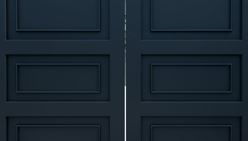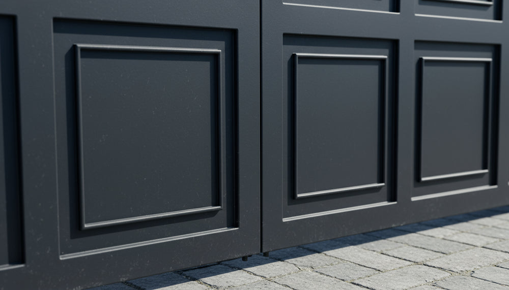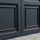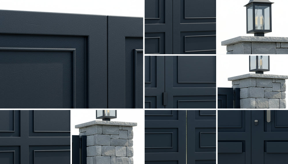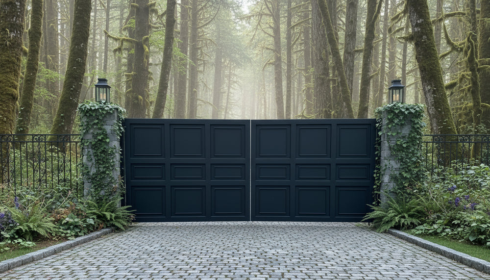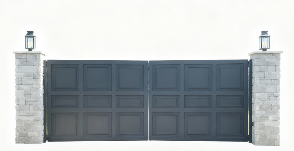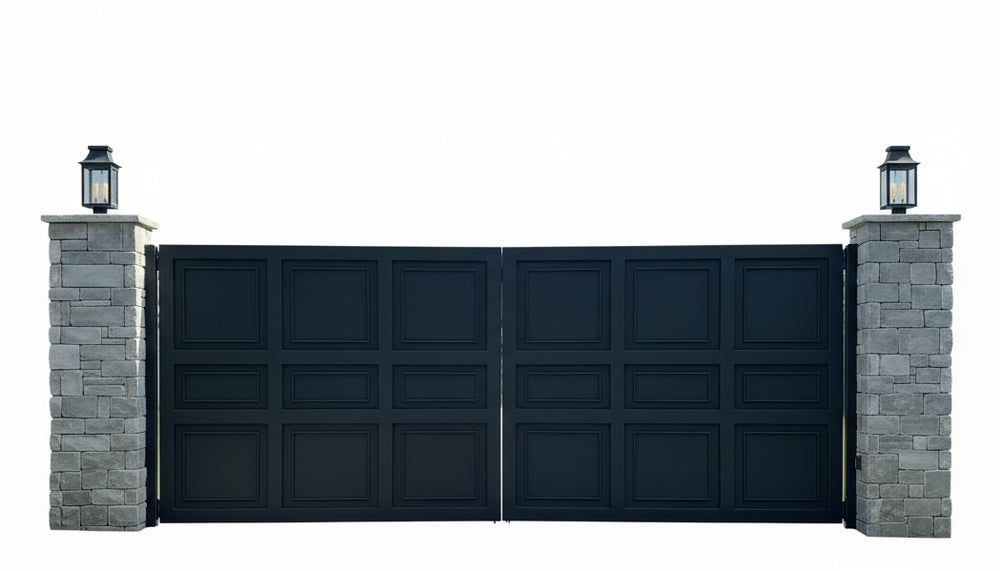 A gate that stands with quiet authority. Stonecrest Classic features dual swing panels with clean rectangular geometry, framed in matte black steel and flanked by uniform gray stone pillars topped with lantern-style fixtures. The symmetrical layout and solid construction evoke permanence and prestige, while the minimalist design ensures compatibility with both traditional and modern architectural styles.