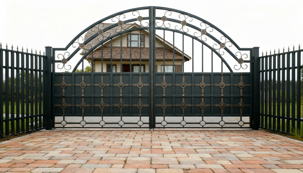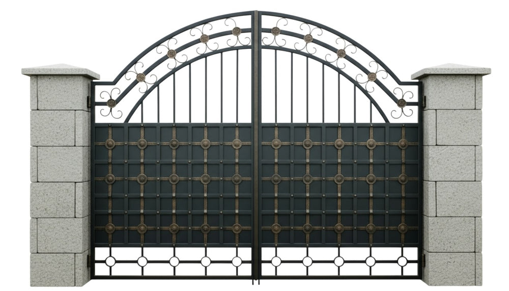 A gate that balances strength and artistry. Stonegrid Crest features dual swing panels with an arched top rail adorned with scrollwork and circular flourishes. The lower section showcases a geometric grid pattern punctuated by circular motifs, offering both structure and visual rhythm. Flanked by irregular stone pillars in earthy tones, this gate evokes timeless elegance and grounded sophistication.