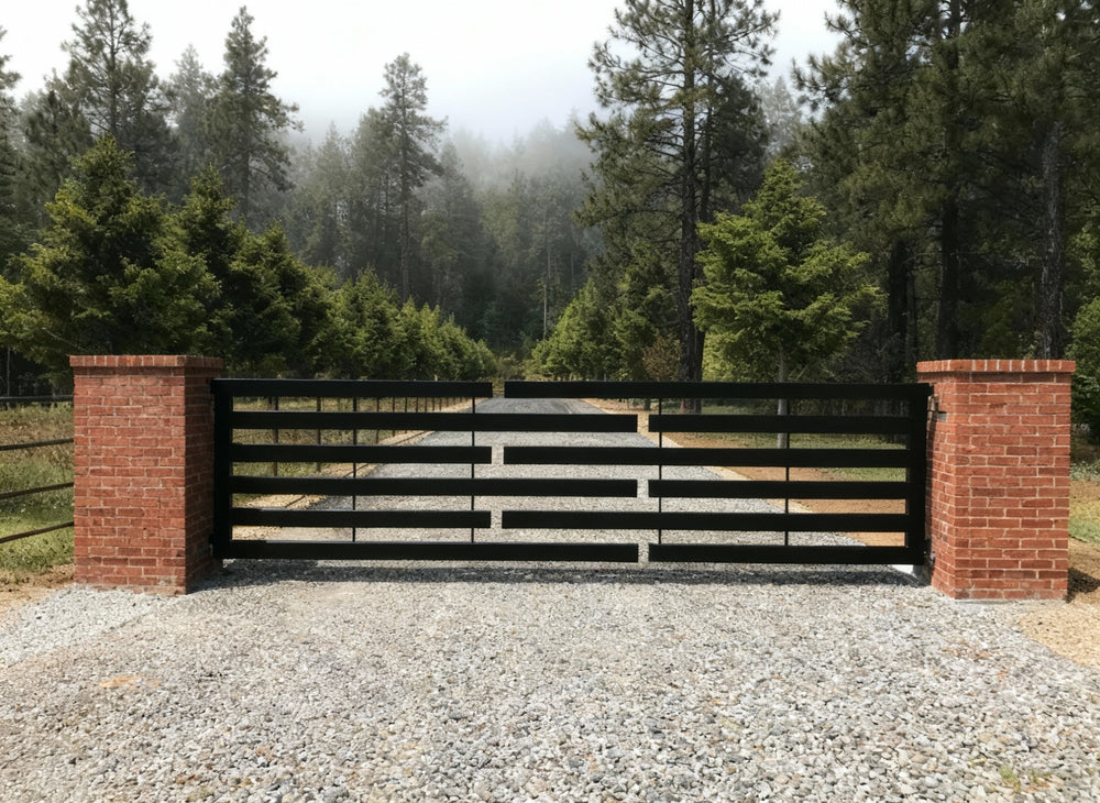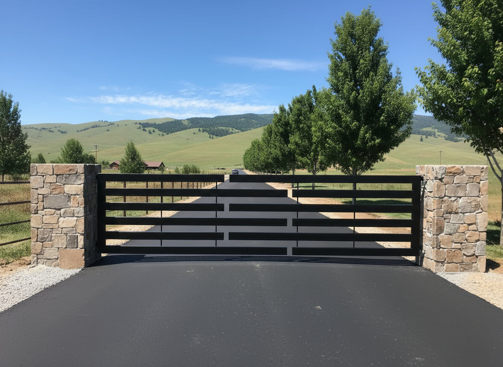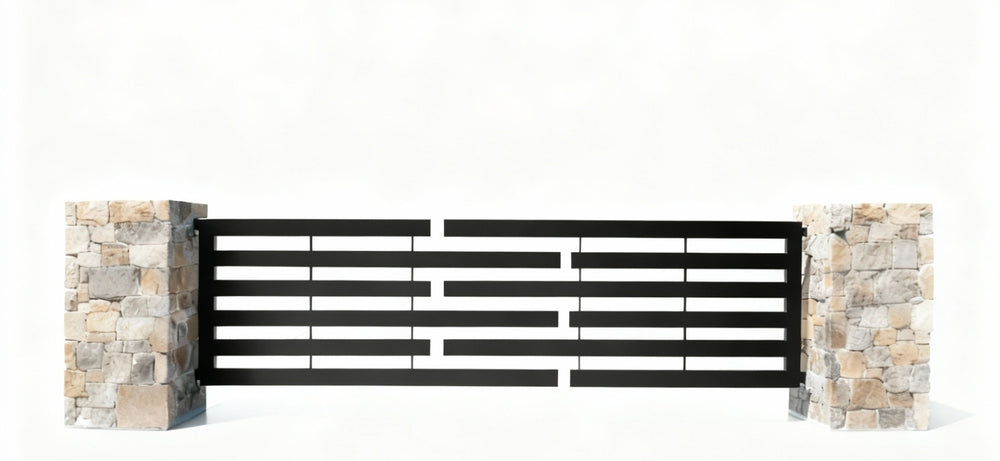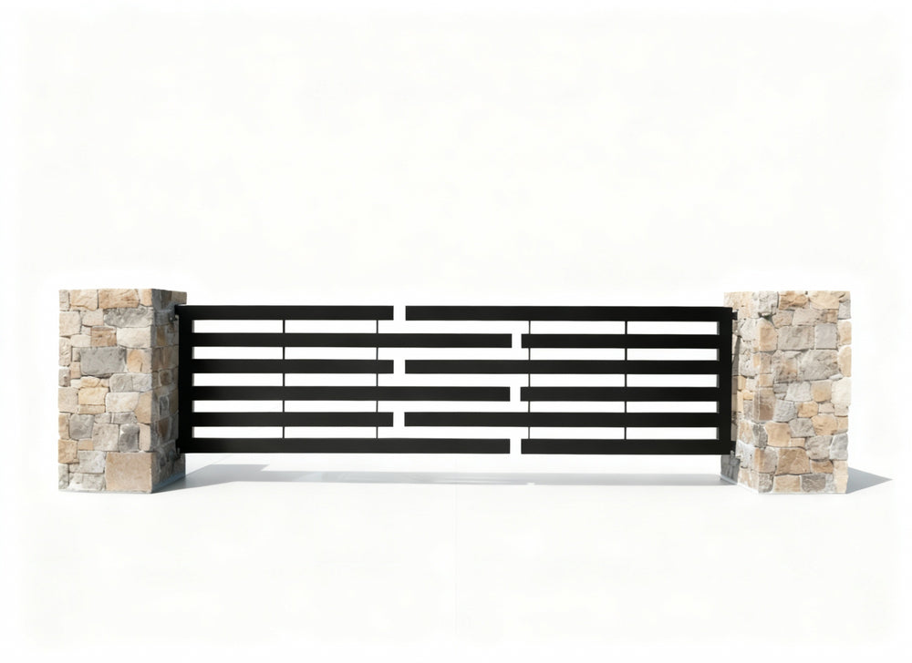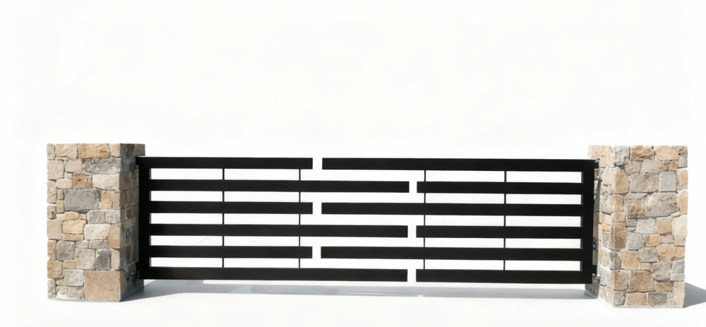 PA gate that speaks in layers. StrataLine Modern features dual swing panels composed of staggered horizontal slats, creating a rhythmic visual flow that’s both minimalist and dynamic. Flanked by stone pillars in mixed tones of beige, gray, and brown, the gate’s matte black finish offers bold contrast and contemporary curb appeal. Perfect for properties that blend rustic textures with modern design language