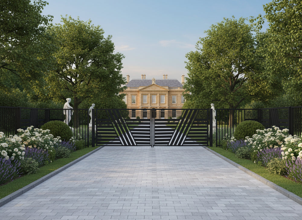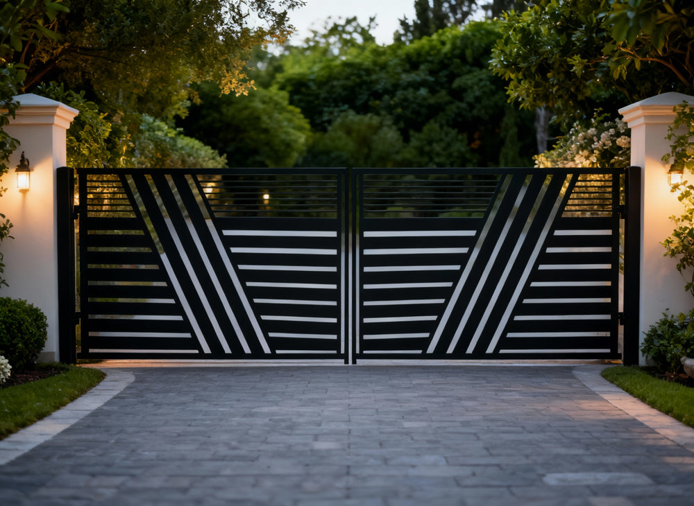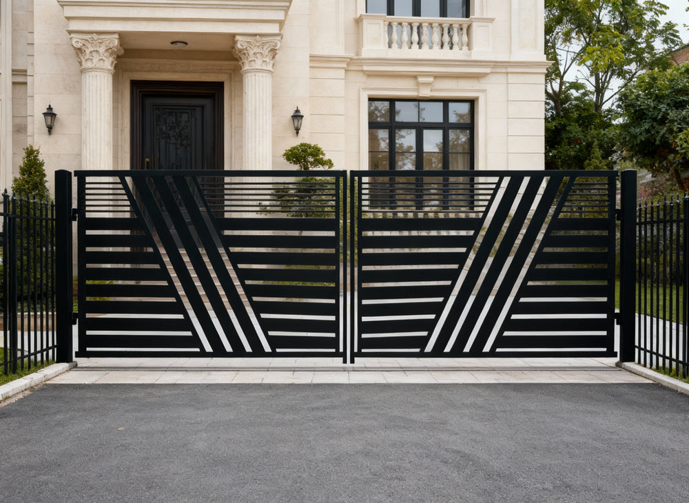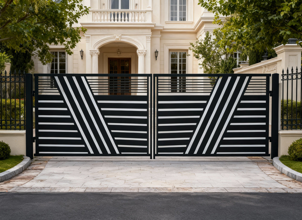 modern diagonal slat gate, architectural metal driveway gate, contemporary estate entrance, Canadian custom gate, Taimco geometric gate, minimalist security gate, heavy-duty metal gate design