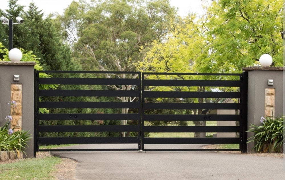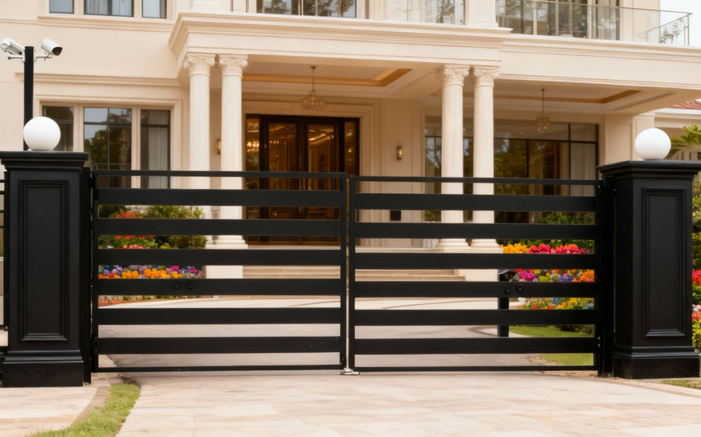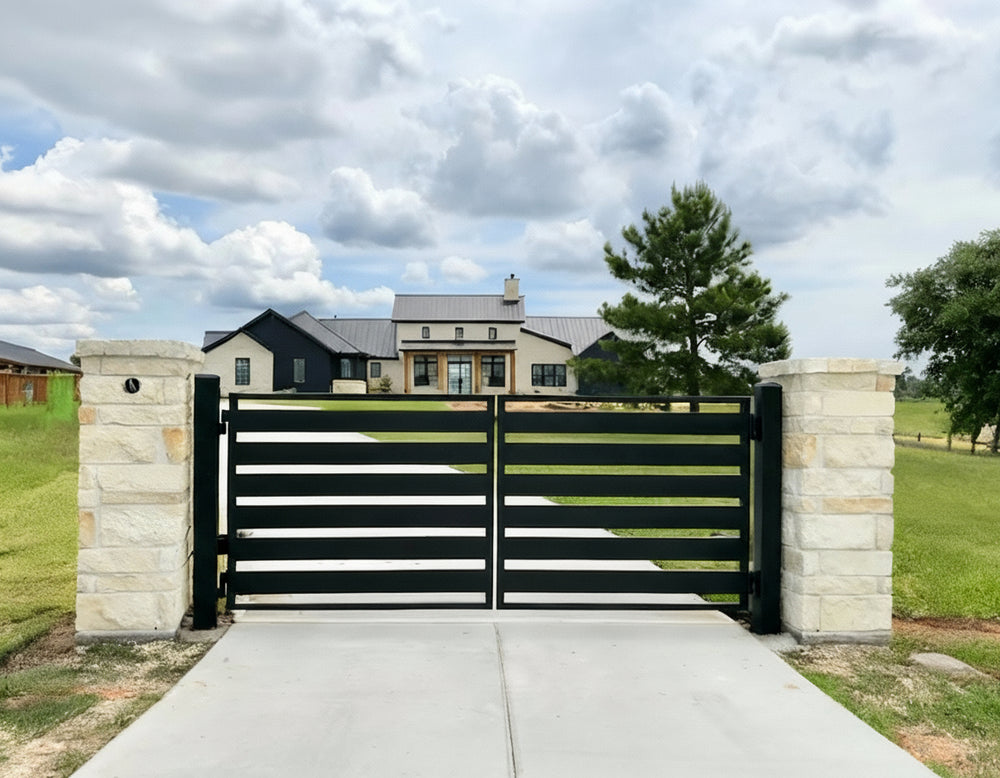 Elevate your entrance with Stratus Linea, a sleek double swing gate featuring precision-aligned horizontal slats and a matte black finish. Framed by light stone pillars and accented with spherical lighting, this gate offers privacy, symmetry, and contemporary elegance—perfect for upscale residences, minimalist estates, or countryside villas with architectural flair.