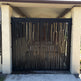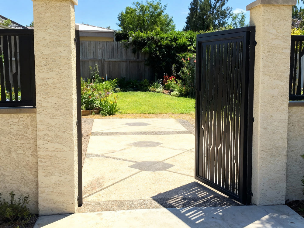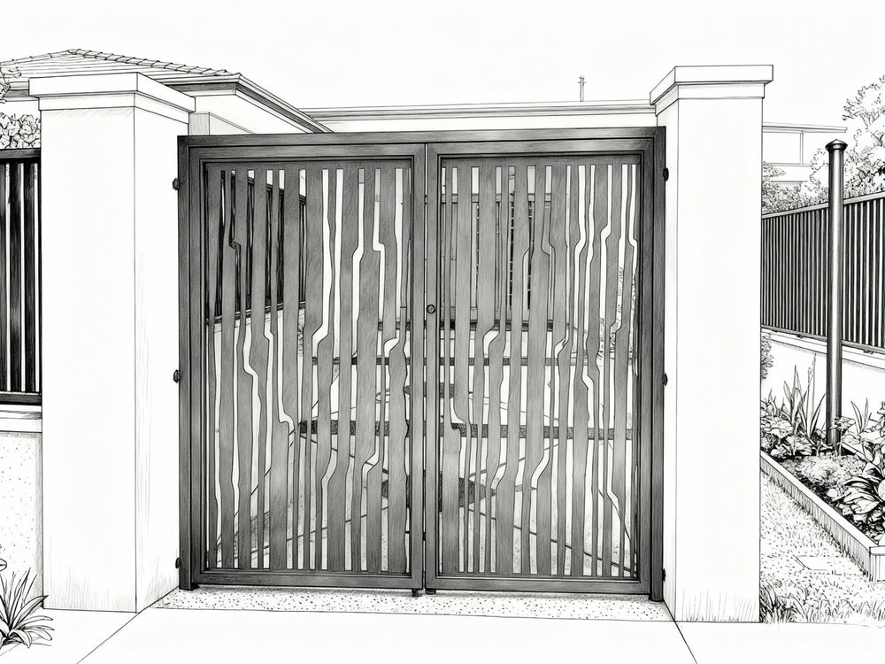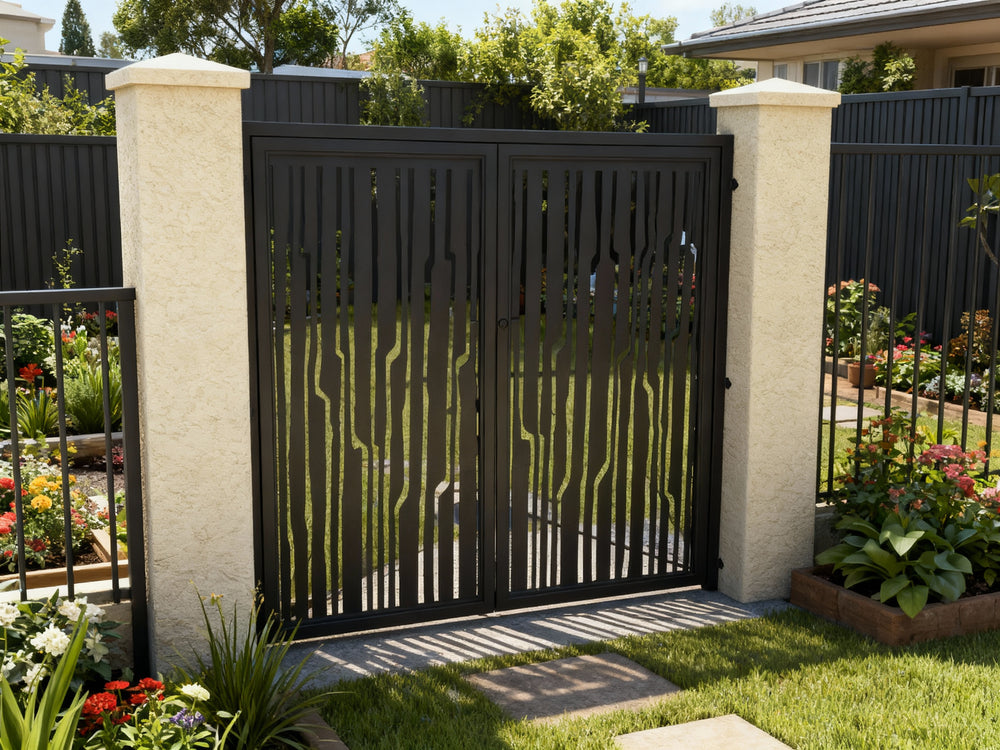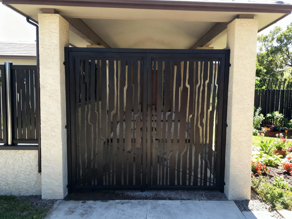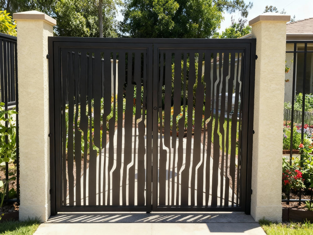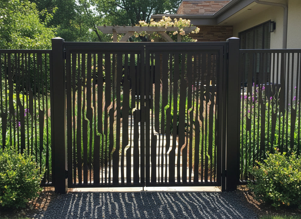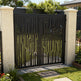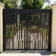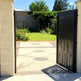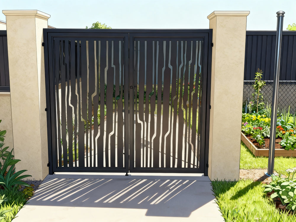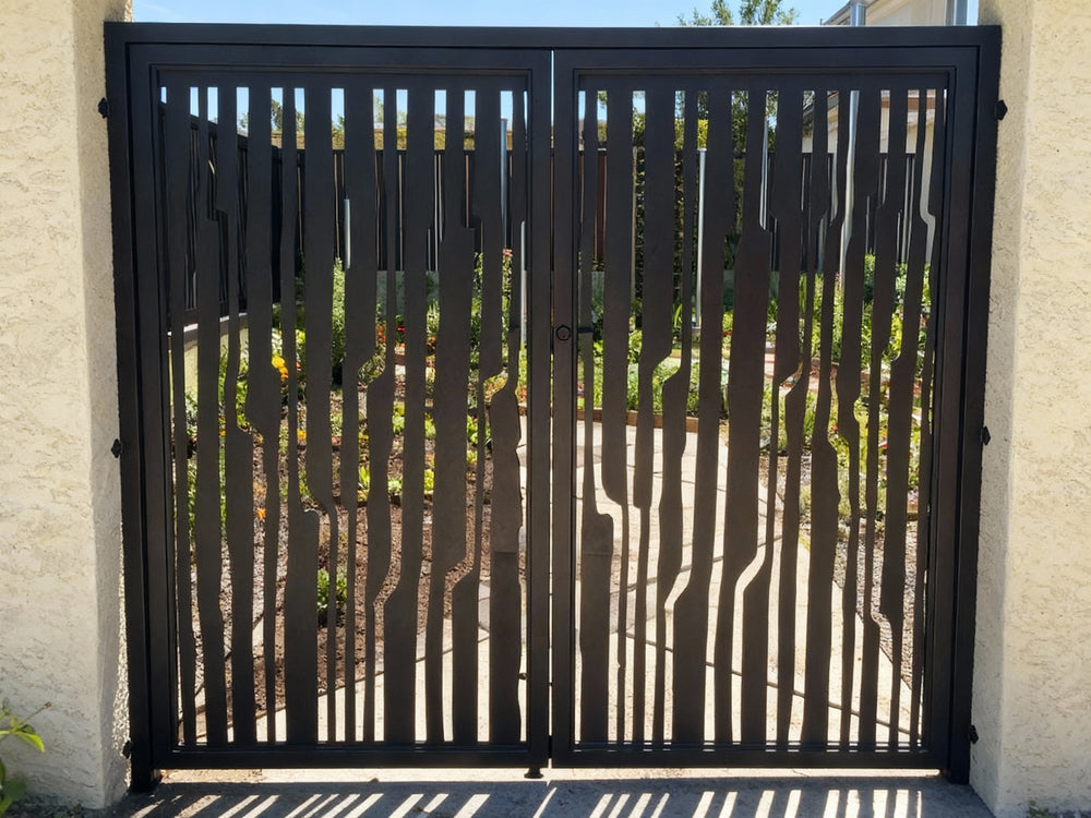 artistic stripe man door, abstract metal side gate, black-and-white garden entry, Canadian custom gate, Taimco modern passage door, manual operation alley gate
