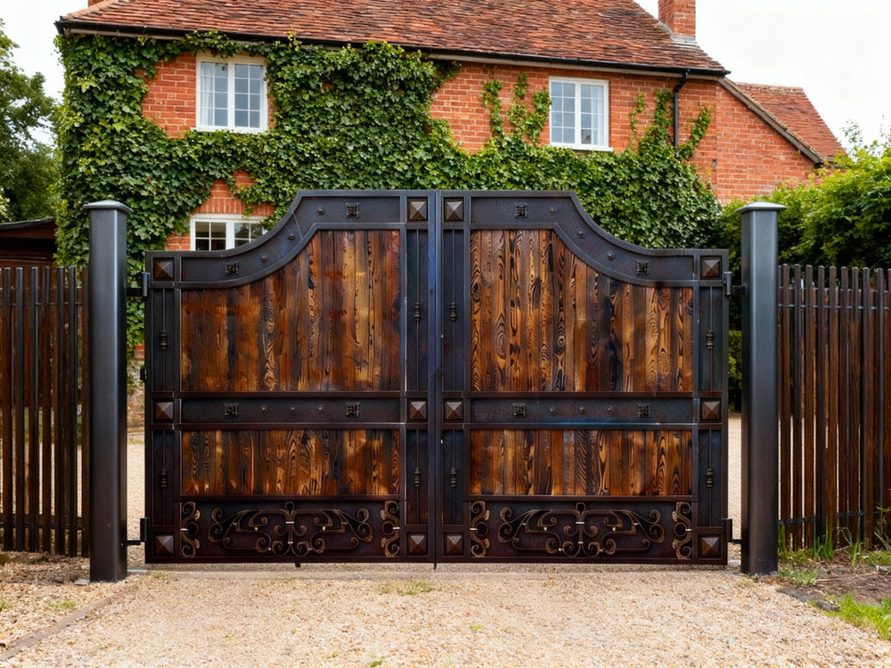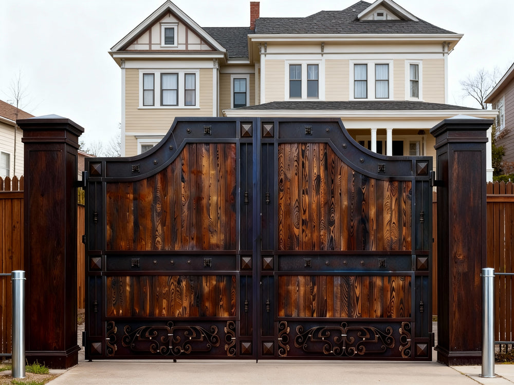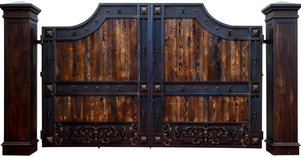 A gate that anchors the estate. Stud forge Drive features rich vertical wood planks framed in dark metal, accented with decorative rivets and square studs. The curved top adds architectural grace, while the bottom scrollwork introduces ornamental rhythm. Designed for wide residential driveways or commercial entries, this gate blends woodworking warmth with forged metal strength.