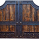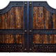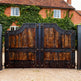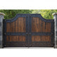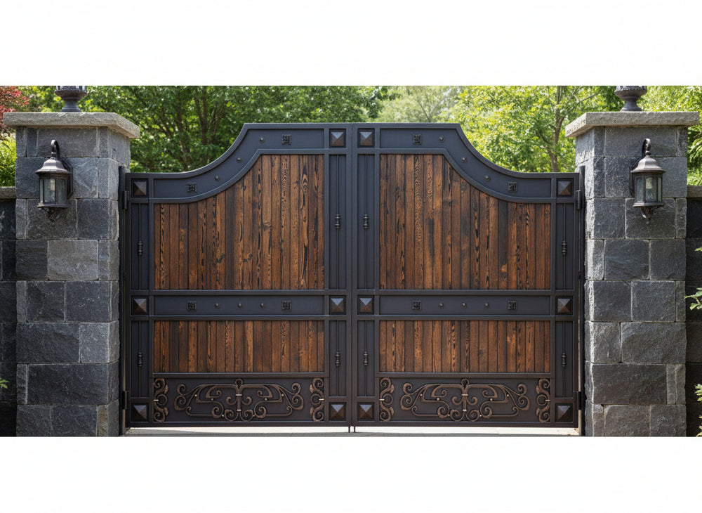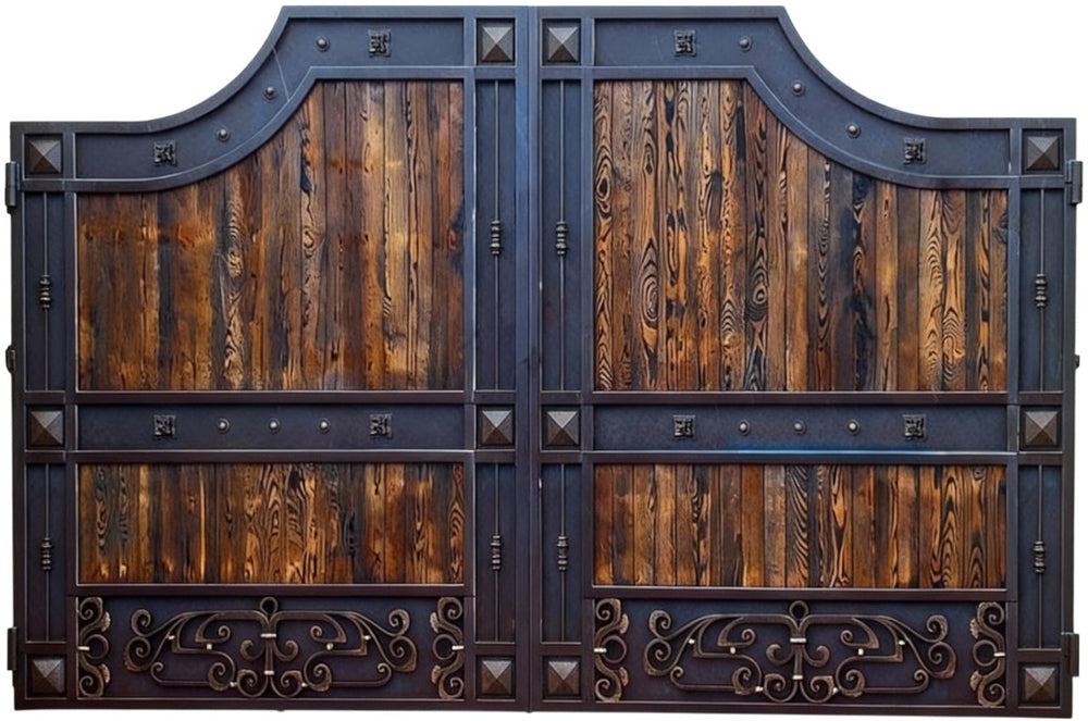 Studforge Drive – Ornamental double-panel wood-and-metal driveway gate with riveted frame, scrollwork base, and arched silhouette Model # MG280