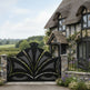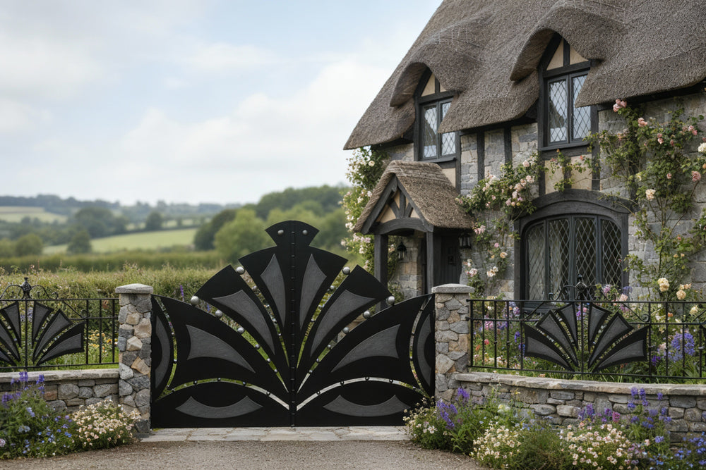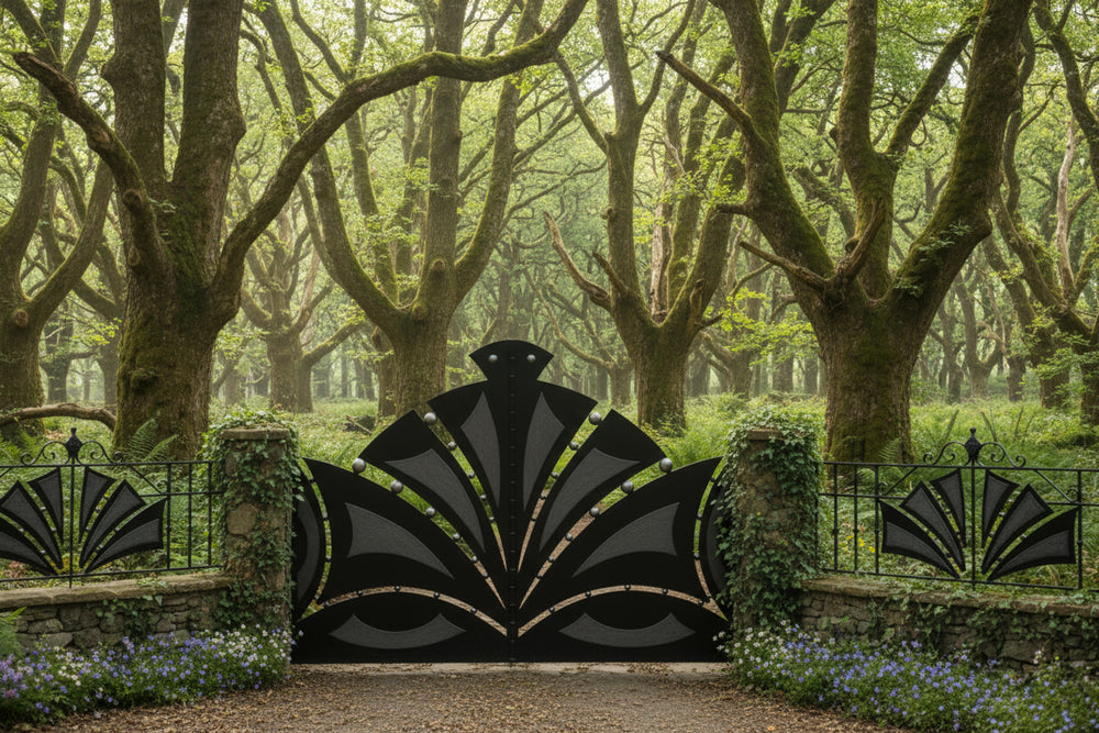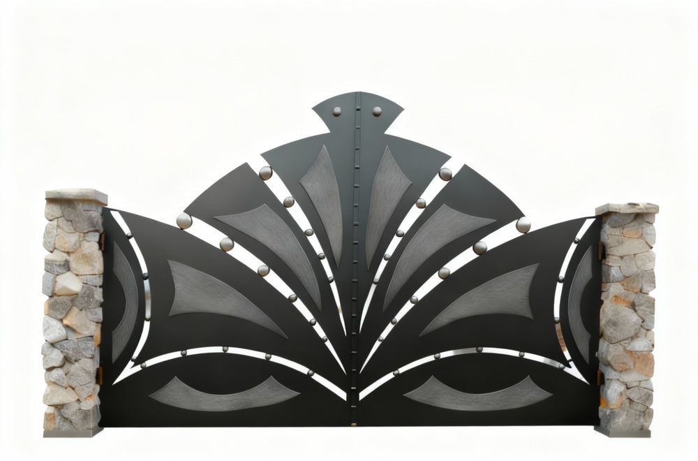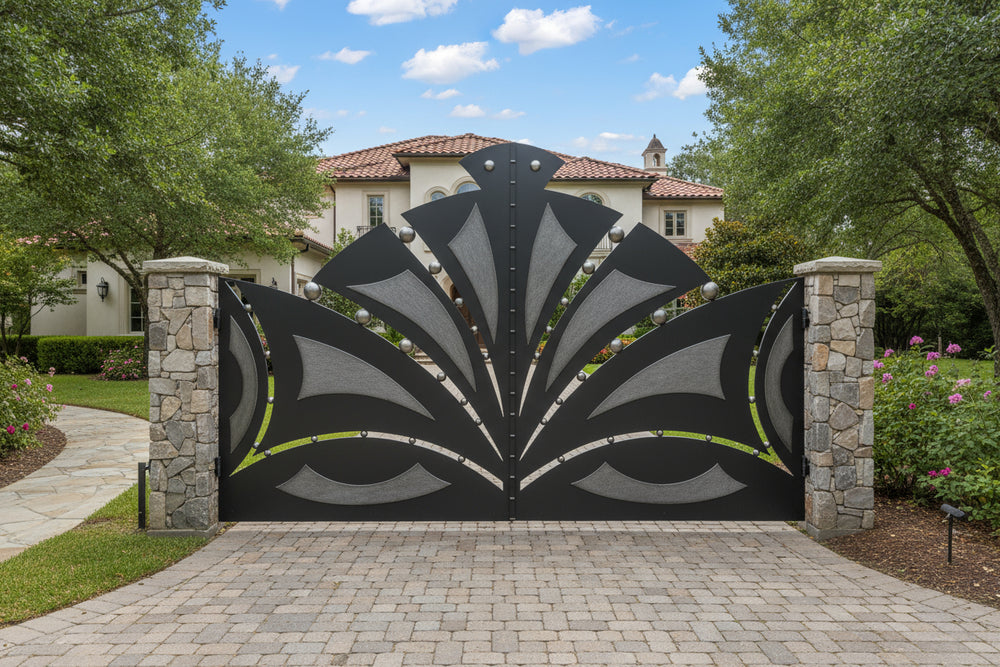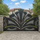 Make a bold statement with the Majesty Gate, a laser-cut steel driveway gate that blends architectural elegance with modern craftsmanship. Featuring a symmetrical feather-inspired design accented with copper-toned spheres and textured inlays, this gate is more than a barrier—it’s a signature piece for your property.