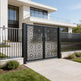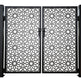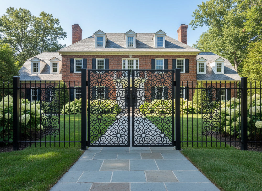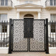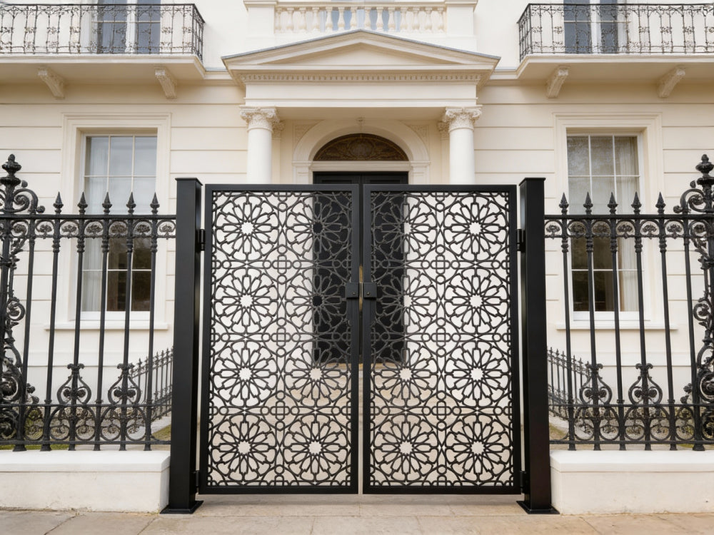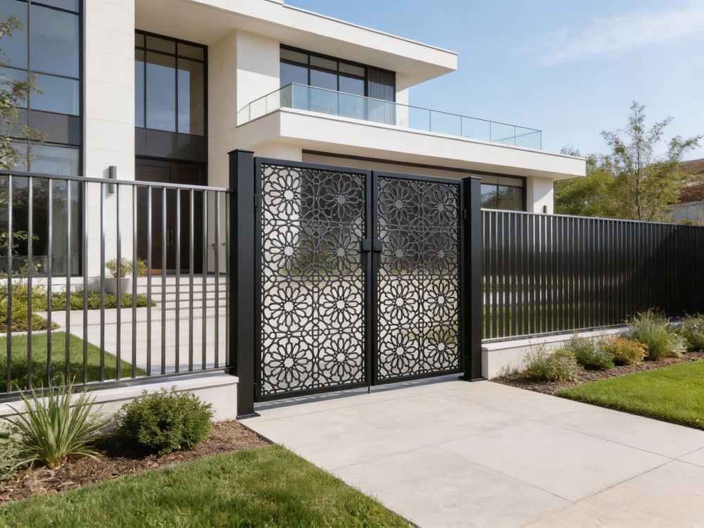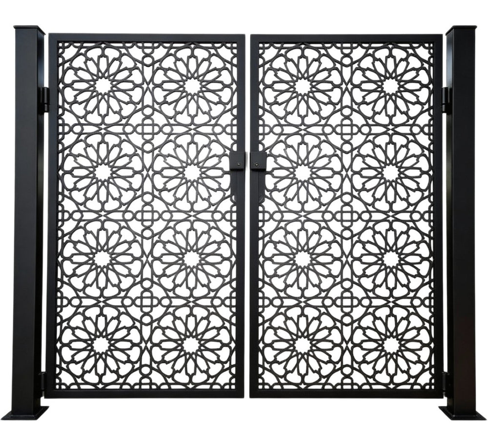 A door that radiates warmth and symmetry. Sunburstveil Passage features two mirrored panels framed in matte black, each showcasing a grid of circular floral motifs—stylized sunbursts with petal extensions—interlinked by angular geometric lines. The design offers partial visibility and ventilation while delivering architectural elegance and ornamental charm. Ideal for garden entries, boutique walkways, or residential transitions, this man door blends radiant geometry with secure craftsmanship.