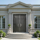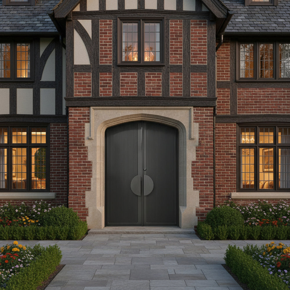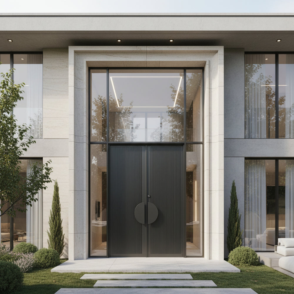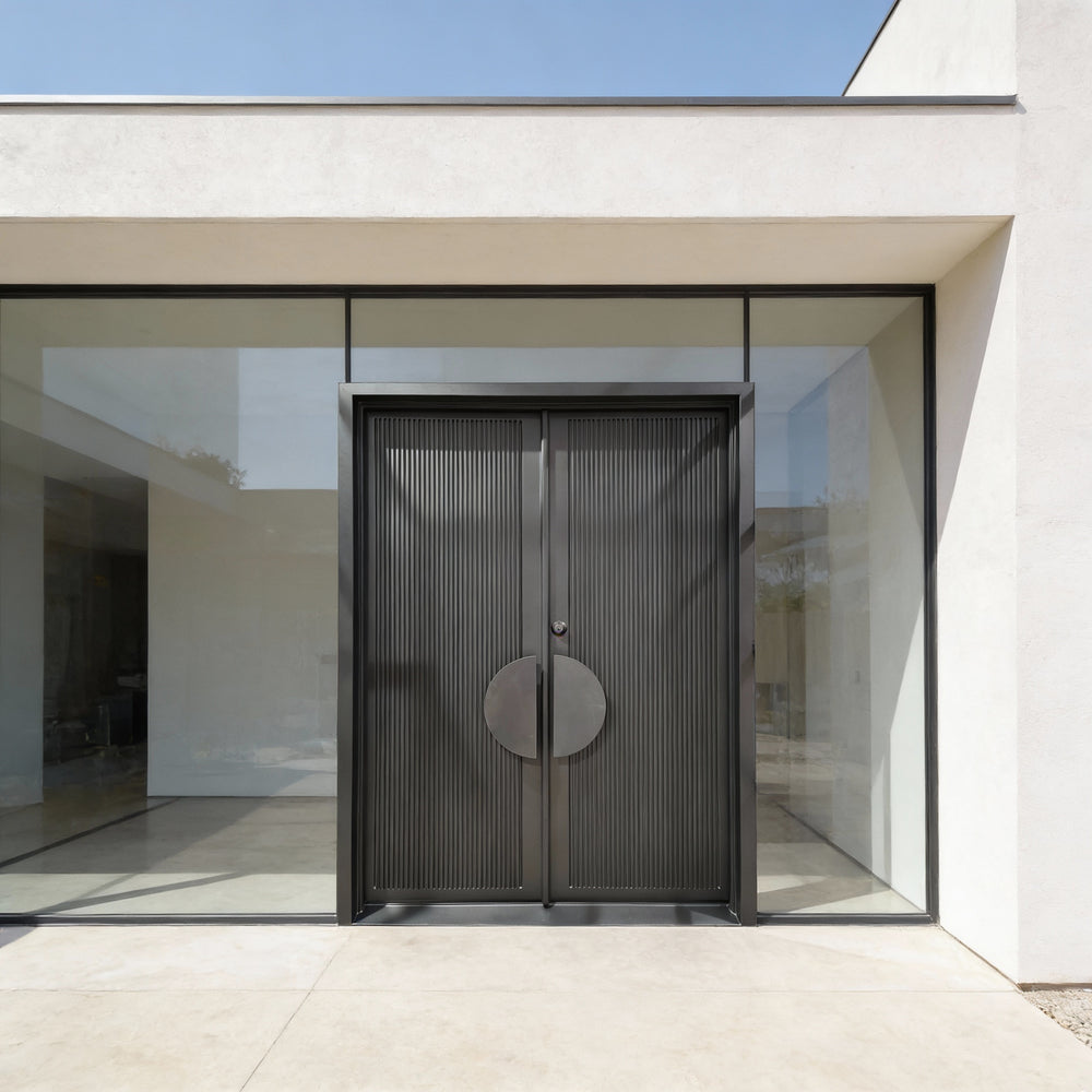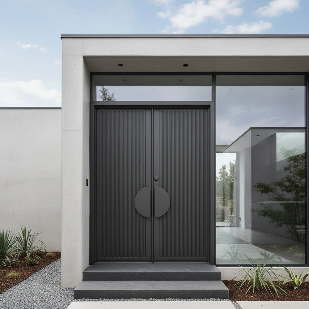 celebration of symmetry and simplicity. These matte black steel double doors feature textured vertical ridges and a signature split-circle handle design—making an architectural statement while maintaining functionality. The round central handles blend industrial charm with balance, and the added peephole improves visibility and security.